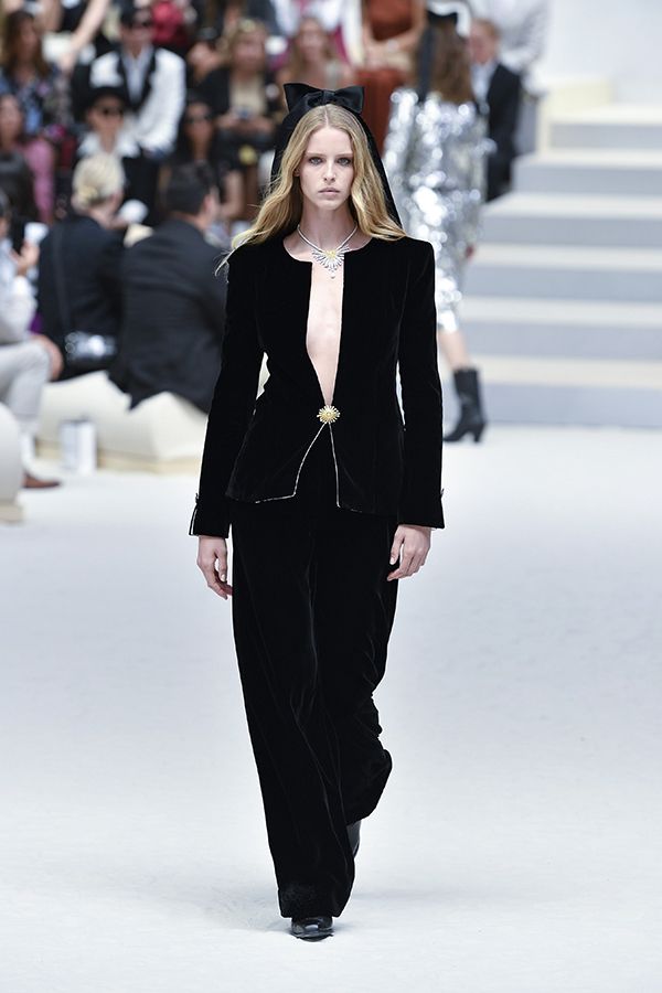 Chanel低胸又寬肩,帶有陽剛氣息的西裝套裝,與頭部蝴蝶結呈現衝突感,個性全黑的西裝卻低胸直達肚臍,並在前中縫上細緻鈕釦,展現叛逆、追求自由的品牌精隨。