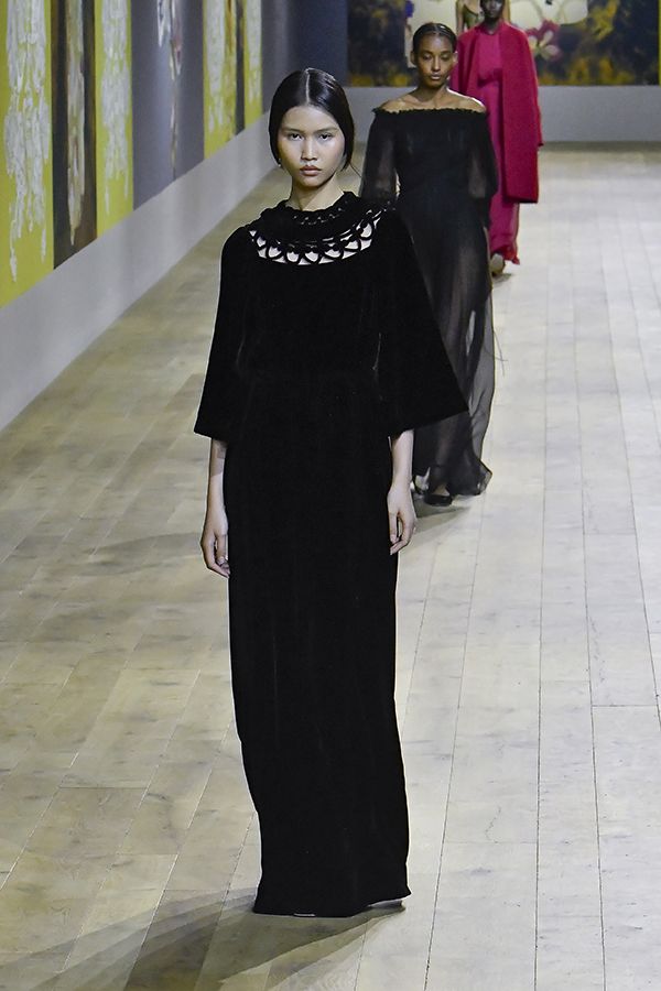 Dior的全黑天鵝絨晚宴服,以及地裙長搭配七分袖展現優雅,並在領部加入民族鏤空編織工藝,微露肌膚展現細緻的設計細節。