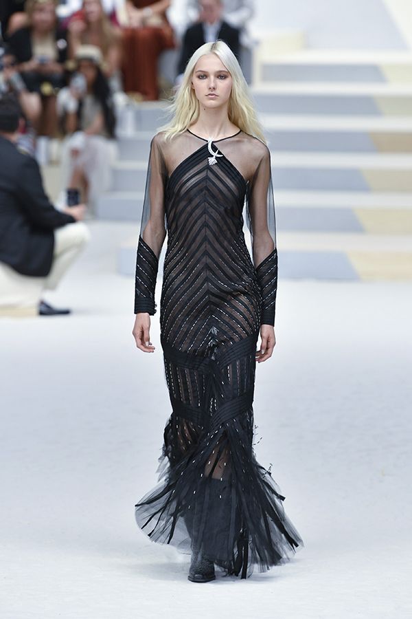Jean Paul Gaultier選擇扁平的條狀線和孔洞,以前中孔洞做為基底,向外編織出寬肩收腰、凸顯身形的魚尾長禮服,並從肩部向外延伸出及地的長流蘇,精湛的工藝讓人目不轉睛。