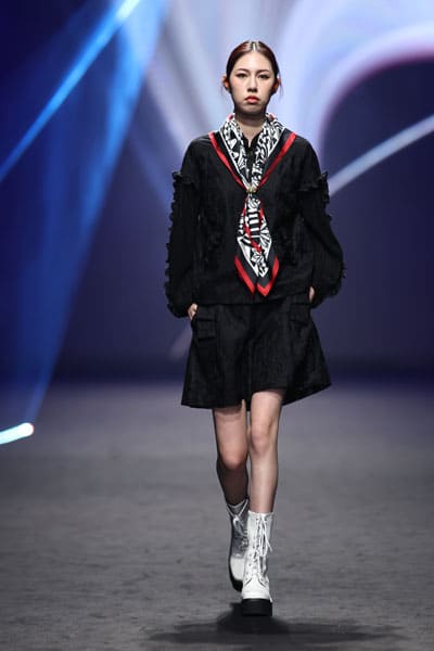 日間篇章以黑、白、紅為敘事基調,體現都市的冷靜與創作熱度。細緻的鼠尾工藝(Queue de Rat)與細抽荷葉打造立體結構和動感效果,勾勒出節奏感和動態張力。