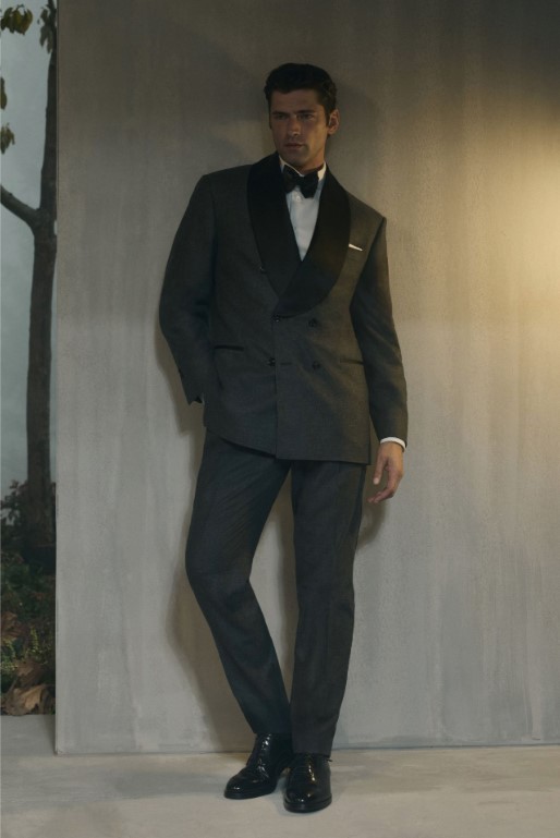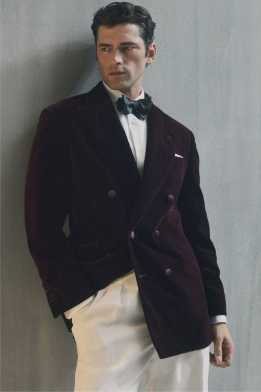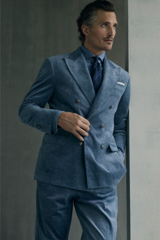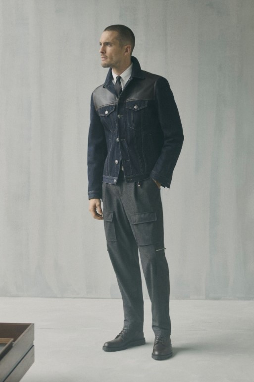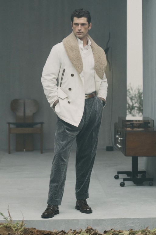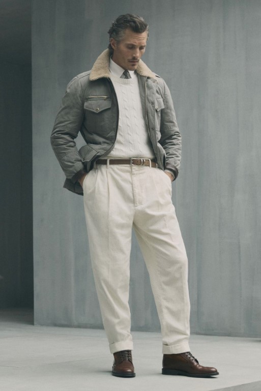 色彩選擇以米色、赭色、灰色為基調,搭配深藍與栗色點綴,呈現出如深秋大地般的豐富層次。結構上常見加寬肩部、柔軟雙排扣與寬鬆後染長褲,於行走間展現自在的律動。材質混搭頂級喀什米爾羊毛、麂皮、羊羔絨與立體織紋面料,既保有服裝的立體輪廓,又展現極致溫潤的觸感。領口處精緻的翻領細節與金屬鈕釦。