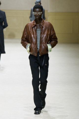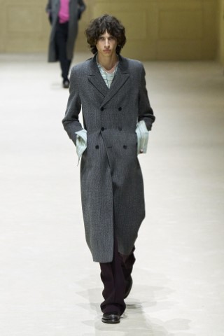 巨大的袖子比例改寫了傳統框架,即使雙手插口袋,視覺依舊強烈。圓領襯衫與非典型背心模糊了正式與休閒的邊界。傾斜的鐘形帽、被壓扁的漁夫帽,展現出一種「剛從衣櫃翻出來」的漫不經心。外層以黑、灰、駝色為主,內裡則大膽撞色鮮紅與亮黃。風衣與皮革外套結合了實用功能的披肩斗篷,同時加入富有童趣的運動風元素與飽和色彩。