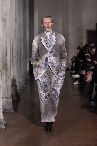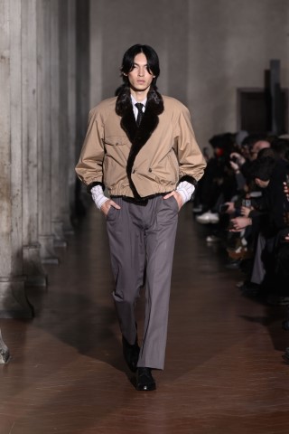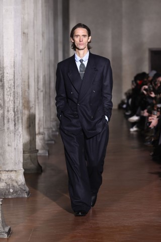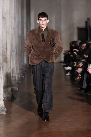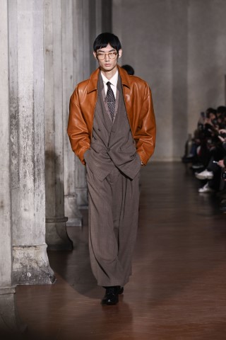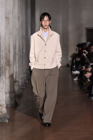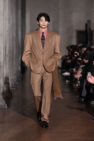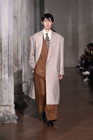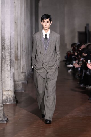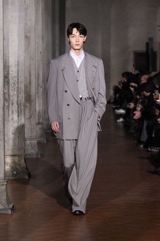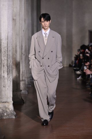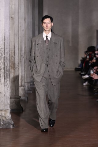 本季以「復刻菁英」為核心,將80年代日本泡沫經濟時期對「義大利製造」的崇拜,轉化為設計理念。核心為權力裝束的軟化,設計深受Giorgio Armani影響,重新詮釋80年代高階主管的衣櫥。灰、棕色系的雙排釦西裝與寬肩方正剪裁(Boxy cut),雖然承襲了當時的流行輪廓,卻透過誇張的比例與「卡通化」的再造,將傳統的生硬力量轉化為一種迷人的「脆弱感」,達成剛柔並濟的平衡。