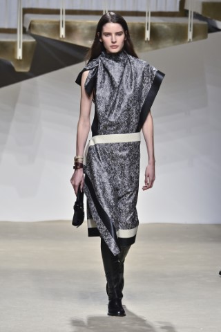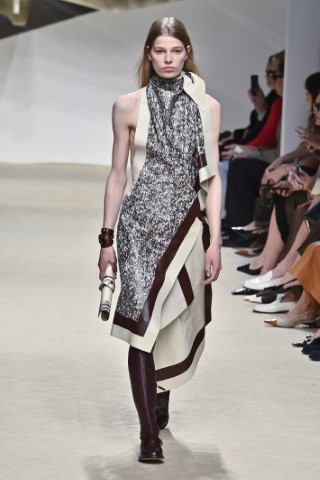 不對稱設計透過手帕式裙襬(Handkerchief hems)、垂墜設計與歪斜門襟,翻新了經典輪廓,提供一種類似波西米亞但又現代的隨興風貌。Etro和Tod’s的不對稱下擺搭配印花,顯得浪漫而具律動感;而透過剪裁拼接,如Jil Sander的不對稱門襟或Ferragamo的拼接皮革洋裝,則展現出一種極簡卻帶有解構主義的建築美感。