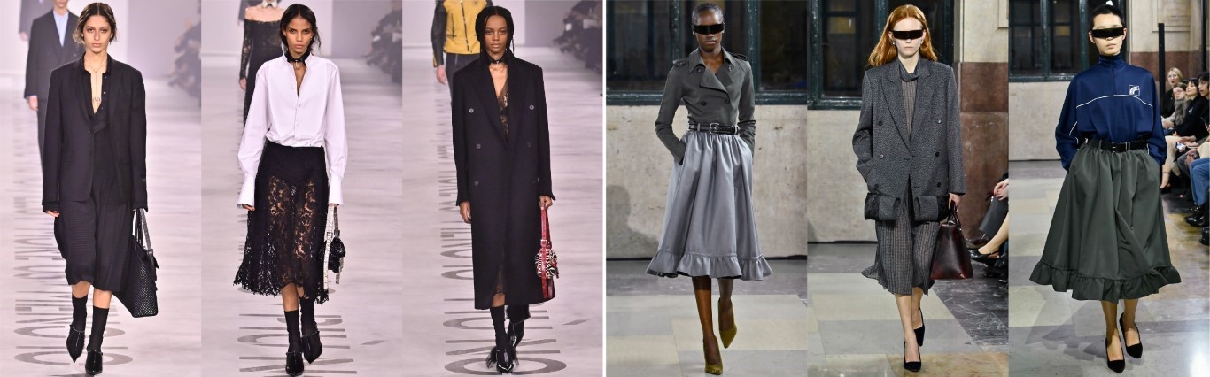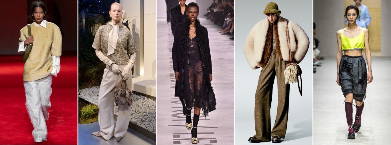 最愛品牌:Jil Sander、Prada、Loro Piana、Brunello Cucinelli。由左至右:Brunello Cucinelli / Jil Sander / Loro Piana / Prada巴黎春天百貨Printemps指出,皮革、皮草、羊絨的溫暖和品質是值得投資,也傳遞安全感。層疊穿搭,巧妙運用透明元素,營造出更深層的層次感。還有重新詮釋的極簡主義,如Jil Sander、Prada的作品。裙裝以各種形式、長度和質地出現,Marni、Prada、Gucci和Fendi都著重展現了女性的柔美氣質,重新定義了裙裝的百搭性。溫暖的大地色調至關重要,營造出安全舒適的感覺。與之形成鮮明對比的是,全黑造型和秀場則展現了一種更深層的視角,如同黑暗的一面鏡子,映照出全球能量的黑暗面。