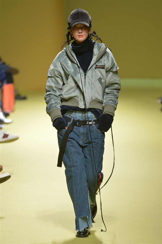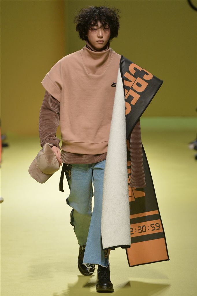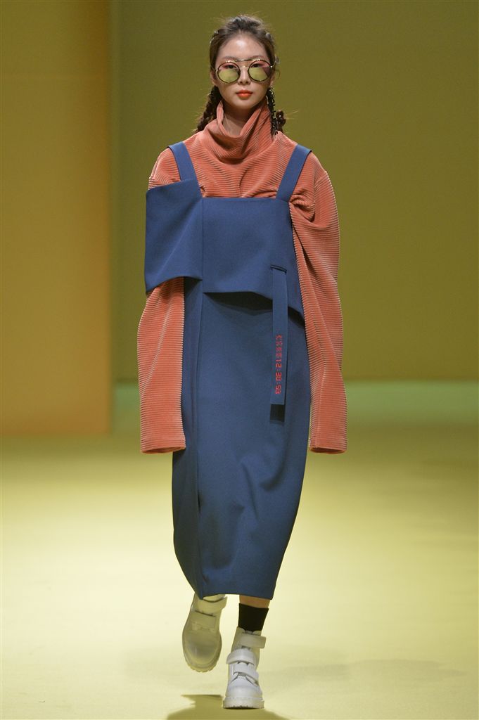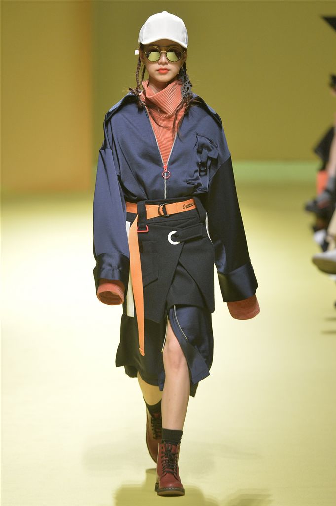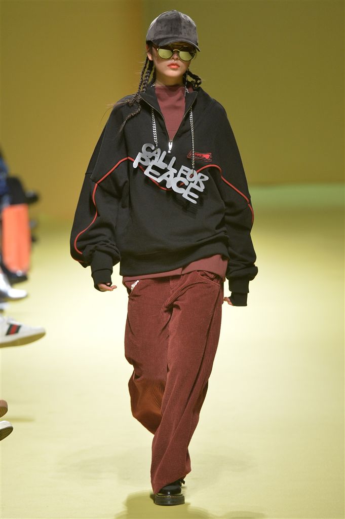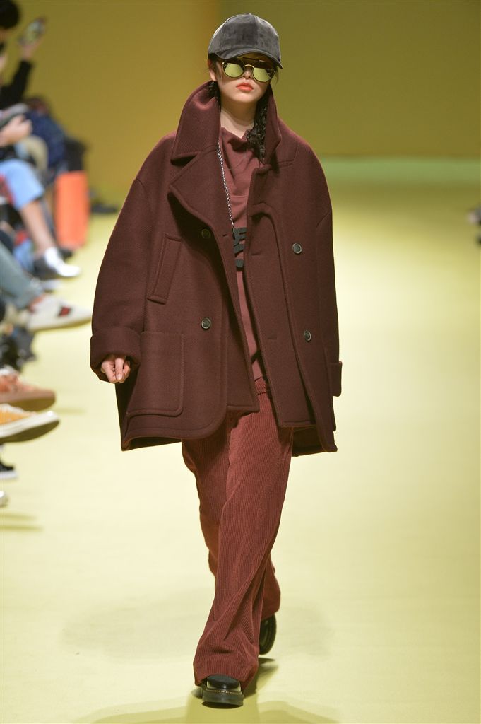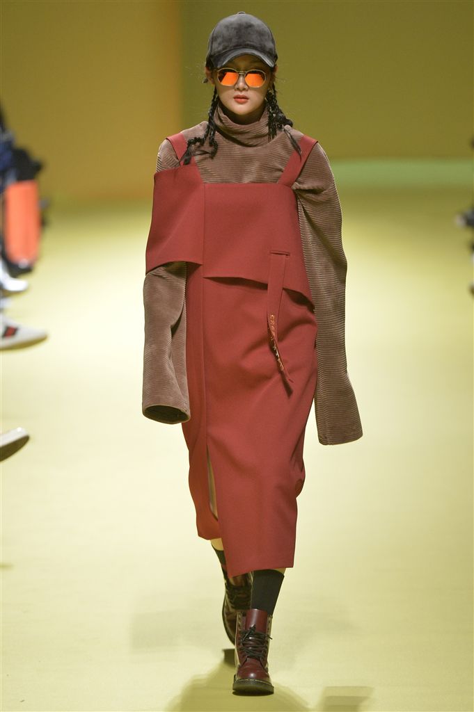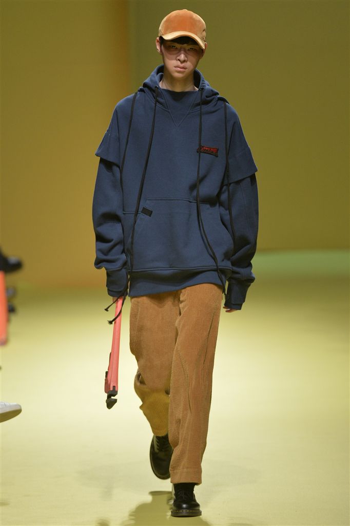 新系列設計師金洪範Kim Hongbum大量運用暖色系色彩,包括紅、酒紅、桃紅、鮮黃、咖啡、卡其等色,結合森林綠、靛藍、天鵝藍。在材質方面,則運用了天鵝絨、絲質面料、牛仔、棉衣,結合挖洞、大翻領、肘臂開岔的懸飾袖、2層袖子或褲管的層次搭配、雙層衣襟、不對稱圍裹、運動環扣帶等細節,打造出天鵝絨運動夾克、帽T、拉鍊半開襟套頭運動衫、側開衩長褲、不對稱開衩圍裹裙、過膝大衣等單品,全系列流露出濃濃的運動風,但又不失前衛幹練。