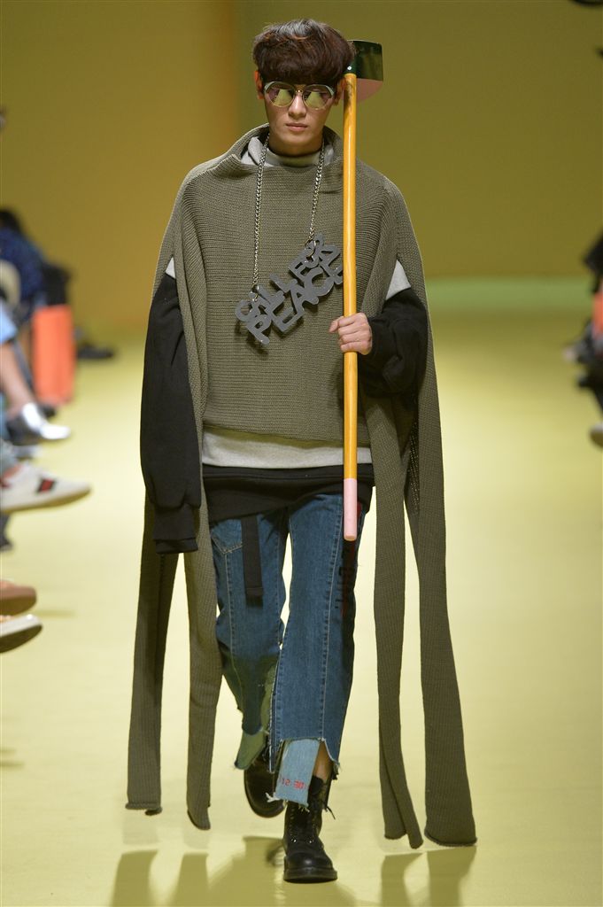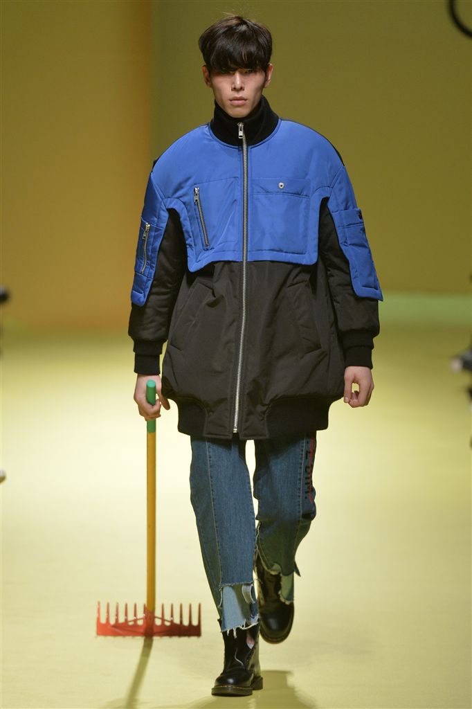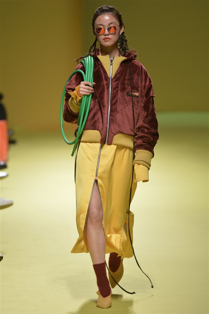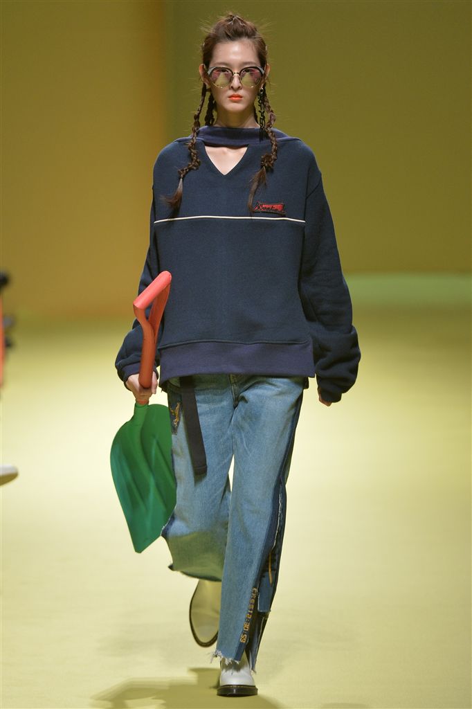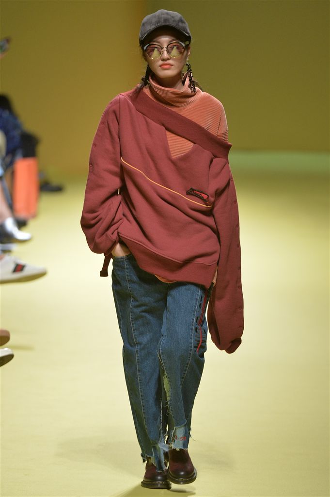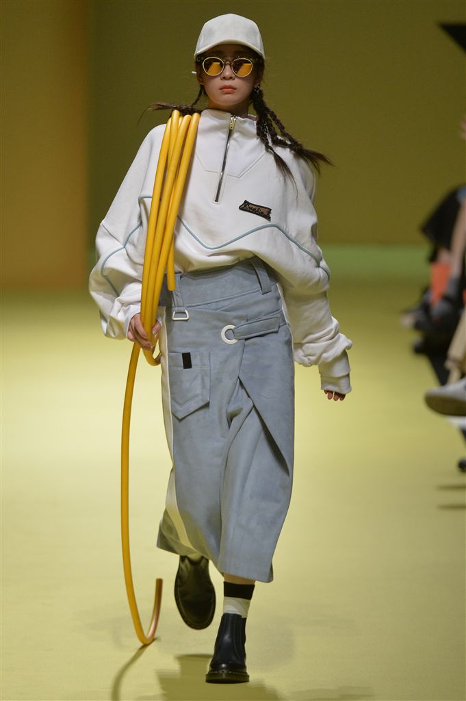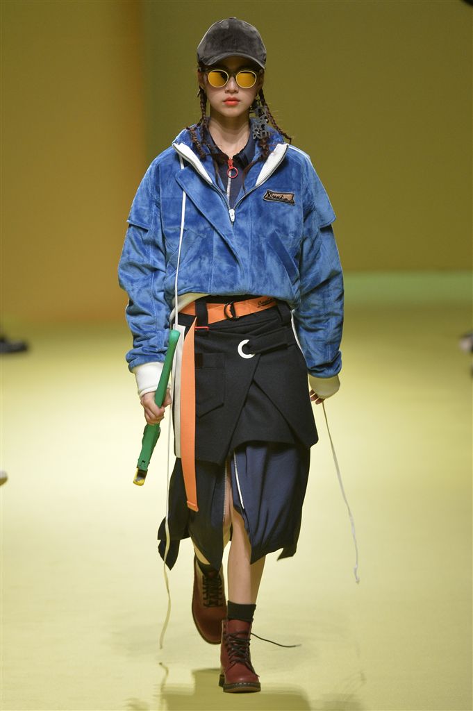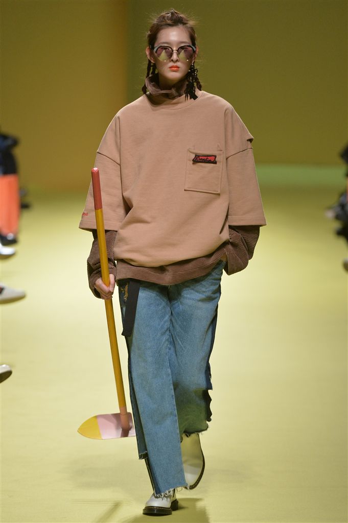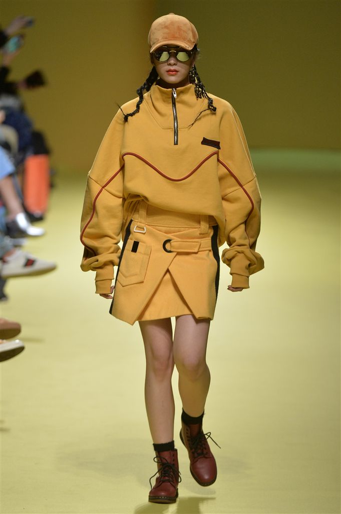 新系列設計師金洪範Kim Hongbum大量運用暖色系色彩,包括紅、酒紅、桃紅、鮮黃、咖啡、卡其等色,結合森林綠、靛藍、天鵝藍。在材質方面,則運用了天鵝絨、絲質面料、牛仔、棉衣,結合挖洞、大翻領、肘臂開岔的懸飾袖、2層袖子或褲管的層次搭配、雙層衣襟、不對稱圍裹、運動環扣帶等細節,打造出天鵝絨運動夾克、帽T、拉鍊半開襟套頭運動衫、側開衩長褲、不對稱開衩圍裹裙、過膝大衣等單品,全系列流露出濃濃的運動風,但又不失前衛幹練。