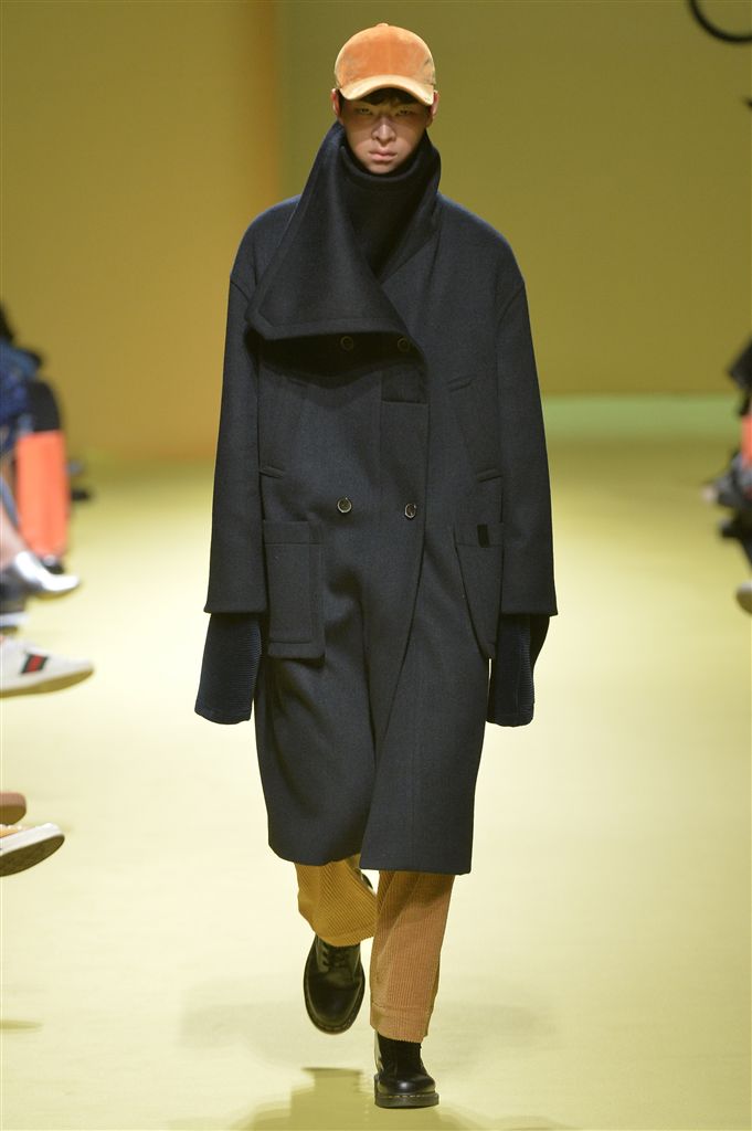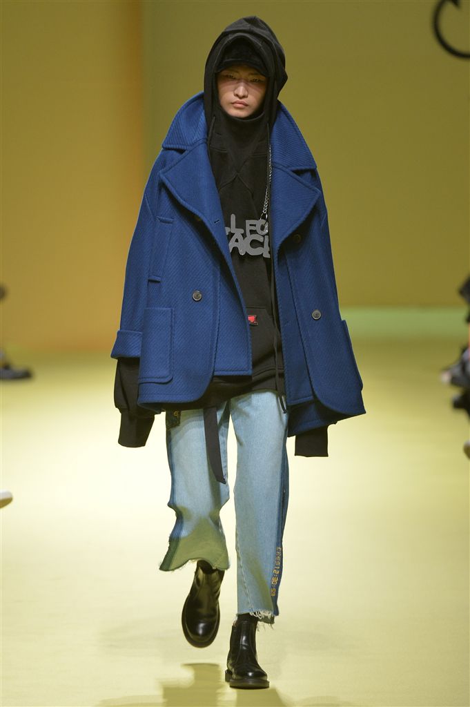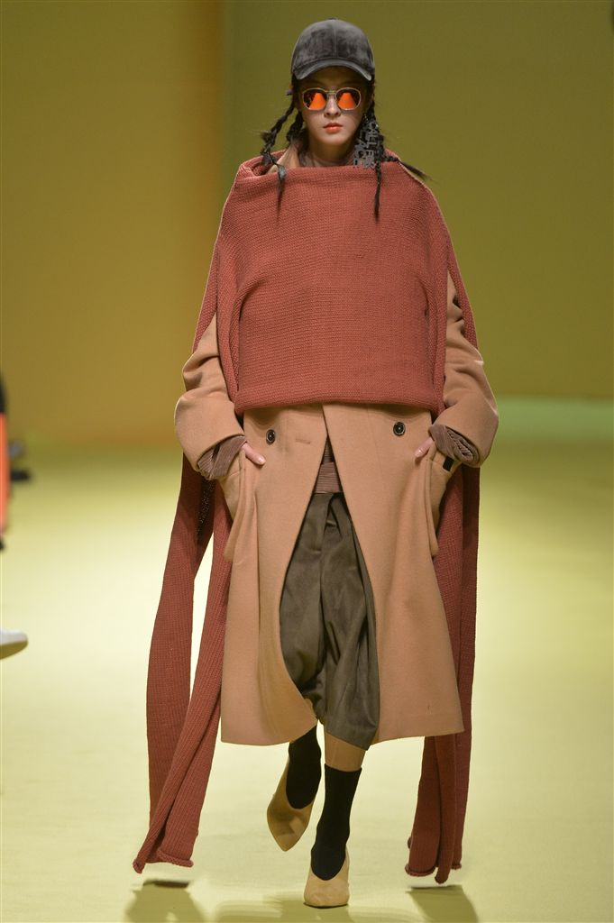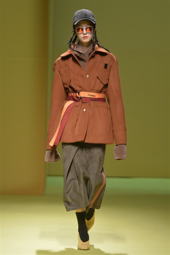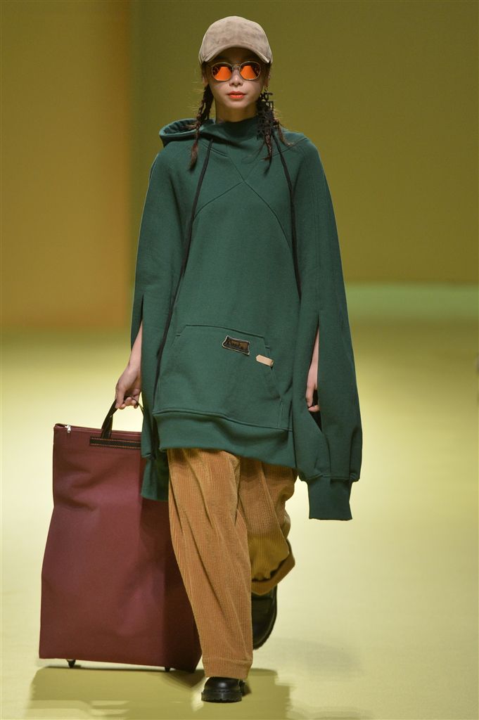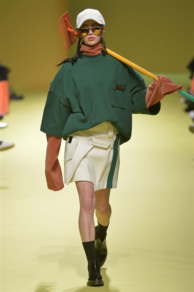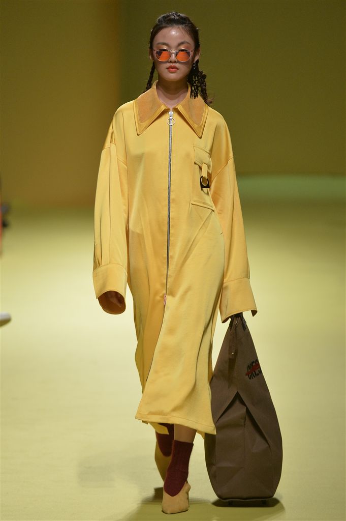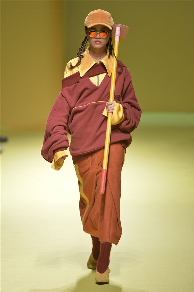 新系列設計師金洪範Kim Hongbum大量運用暖色系色彩,包括紅、酒紅、桃紅、鮮黃、咖啡、卡其等色,結合森林綠、靛藍、天鵝藍。在材質方面,則運用了天鵝絨、絲質面料、牛仔、棉衣,結合挖洞、大翻領、肘臂開岔的懸飾袖、2層袖子或褲管的層次搭配、雙層衣襟、不對稱圍裹、運動環扣帶等細節,打造出天鵝絨運動夾克、帽T、拉鍊半開襟套頭運動衫、側開衩長褲、不對稱開衩圍裹裙、過膝大衣等單品,全系列流露出濃濃的運動風,但又不失前衛幹練。