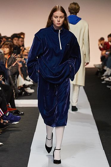 同時藉由強硬與脆弱兩種特質的併呈,拓展女性特質的邊界,例如以浴袍般隨性的繫帶大衣搭配運動拖鞋、繭狀外套與連帽衛衣的組合,既有80年代女強人的風貌,也混合了隨性不羈的造型。