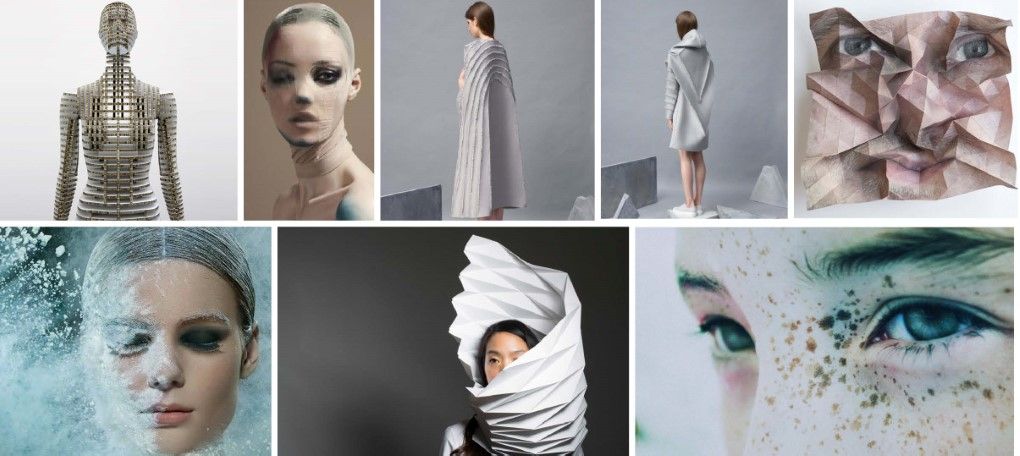 最終應用於陳列的人物造型上,可以自工業製造汲取靈感,運用折疊技巧、鋸齒狀的施工技術,以及尖銳的刻痕和蝕刻表面,衍生出不同以往的趨勢樣貌。例如知名日本藝術家吉岡德仁(Tokujin Yoshioka)為Issey Miyake設計的人體模特,以硬紙板切割層疊展現工藝結構。