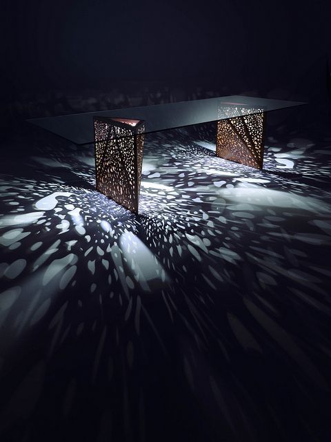 利用物件本身特性與空間作對話,運用反光鏡面、刻面、與光源巧妙的擺放投射,以層次交疊的光影變化(並可暗藏富麗的珠寶色澤於其間),營造出充滿律動與意趣的戲劇性空間。例如建築大師Steven Holl設計的Riddled Table,靈感來自朦朧的天空和銀河星象,利用雷射切割刻面篩漏光線,創造出銀河星系的效果。