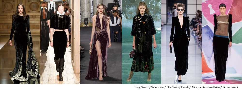 天鵝絲絨一直是高級面料首選,天鵝絨是以絨經在織物表面構成絨圈或絨毛的絲織物,採用蠶絲為經,棉紗為緯交織,向來多為貴重面料,以Elie Saab性感的深V領並露出大腿的晚裝為例,在肩部與腰部縫製立體的珠工與亮片水晶等點綴, 更為提升其雍容華貴的氣質。另外,Valentino與Fendi利用鏤空天鵝絨,詮釋出不同風貌的外型輪廓,Fendi在細節處繡上立體蟲鳥物件,略帶趣味俏皮。至於 Giorgio Armani Privé則保持一貫俐落剪裁,在版型與做工強調極簡又能修飾身形的訴求。