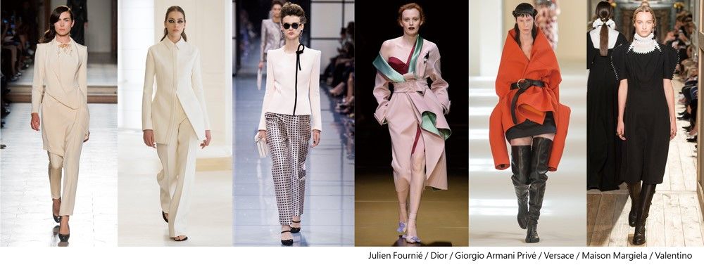 溫暖輕柔的羊毛織物,在2016/17秋冬高級訂製服,呈現較為實穿的款式線條,例如Julien Fournié和Giorgio Armani Privé,套裝的運用加上不對襯開口細節,增加設計巧思。Maison Margiela與Versace則大玩解構誇張造型,將大衣剪接誇大超長袖型,或是在衣襬加上抓褶式的處理,當然也有Dior或是Valentino等較為中規中矩的極簡輪廓。