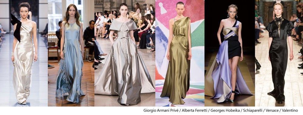 光滑亮澤的絲緞材質,根據其厚薄可以幻化出各種不同的樣貌,以Georges Hobeika和Versace為例,運用較硬挺有厚度的絲緞,整體線條較為厚重有份量, 可將布料的特性有效運用立裁變化立體效果。Alberta Ferretti與Schiaparelli採用的緞料則較為柔軟垂墜,適合詮釋溫柔流暢的外型輪廓。至於Giorgio Armani Privé則保持俐落剪裁,再加上肩上的硬挺蝴蝶結造型採衝突面料點綴,為兩者找到和諧的平衡點。