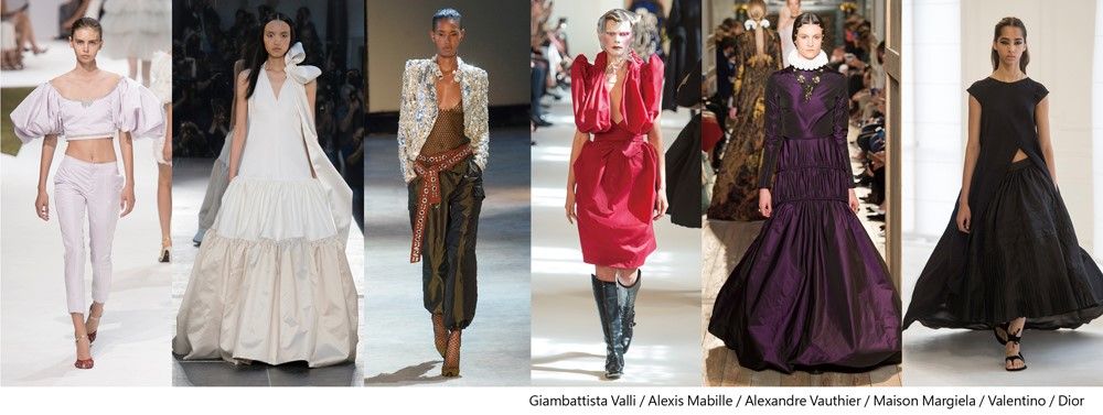 真絲塔夫塔也是較常為高級訂製中常見的面料,因可塑性高可以變化立體褶份,或是利用光澤變化展現高雅風格,就像Dior以一襲簡單不對襯開岔上衣搭配寬大份量十足長裙,於簡潔俐落的線條中添加褶份變化。或是Giambattista Valli利用布料特性製造豐厚分量的誇大蓬袖,Maison Margiela則是玩起褶份轉移與立體剪裁交錯的手法,將服裝輪廓轉變成有趣的外觀輪廓。