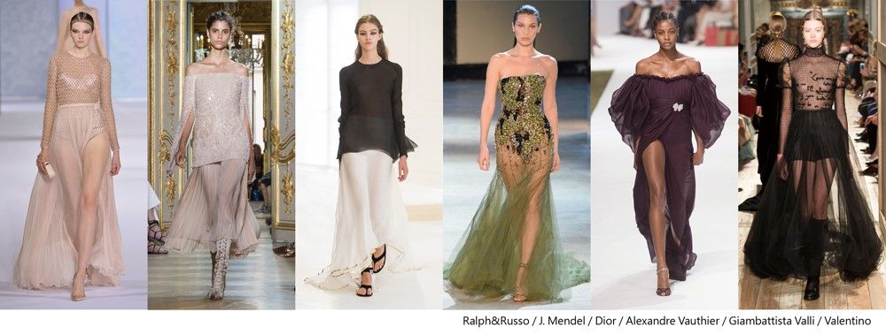 清透飄逸善於展現女性柔美的雪紡薄紗,例如Giambattista採用深紫梅色的神祕色調,透過細褶顯現女性曲線,並在袖子製造份量營造豐富層次,Ralph&Russo、J. Mendel及Alexandre Vauthier則皆是上半身以珠鑽交織縫製再搭配透膚雪紡長裙,性感優雅。另外Dior低調的黑白配色也帶出輕柔雪紡的浪漫情懷,Valentino 則是用略微挺度的薄紗製造優雅哥德式風格。