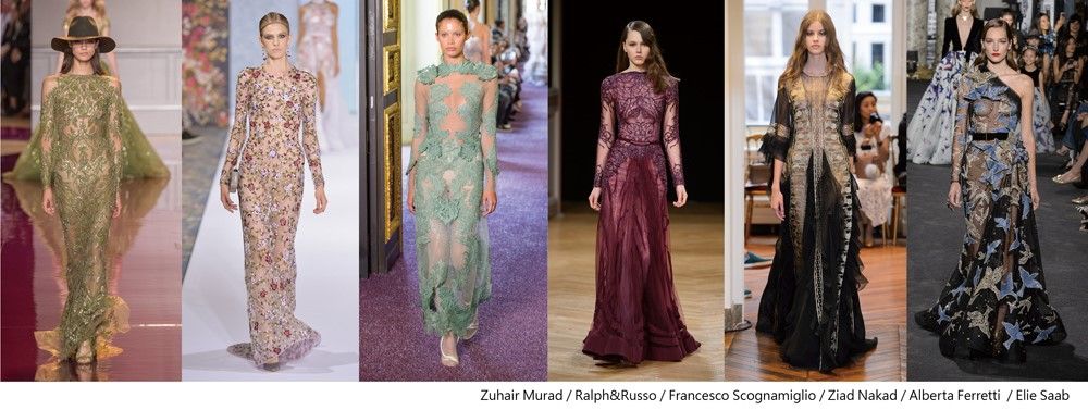 2016/17秋冬高級訂製服,透視與鏤空蕾絲元素依然獲得大量運用,但是蕾絲的圖騰卻不再只是花朵應用,更有動物或是幾何意象的編排,例如Alberta Ferretti的鏤空蕾絲,黑與金的結合相當具有異國風情。另外,Ralph&Russo雖為花型卻是以色彩繽紛的細小花朵與葉片藤蔓交織而成網格的脈絡,別具一番風情。
