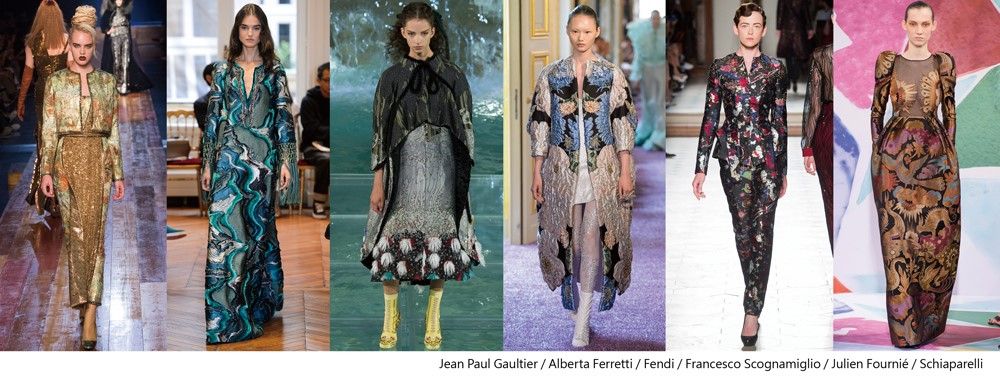 2016/17秋冬,提花面料再現高級訂製服的精湛工藝,大面積的使用加上立體剪裁手法,例如Jean Paul Gaultier彷彿在藝術畫作的質感外層塗裹上閃亮金箔。Alberta Ferretti則是以豐富絨布與提花點綴交織,製作的面料猶如一幅漸層的水彩,再搭配上編織流蘇袖口,整體造型非常異國風。至於Fendi和Julien Fournié 則是強調俏皮趣味的圖案變化,其中Julien Fournié是繽紛色彩的星際雲系圖騰,Fendi是一整排站列的裸女。