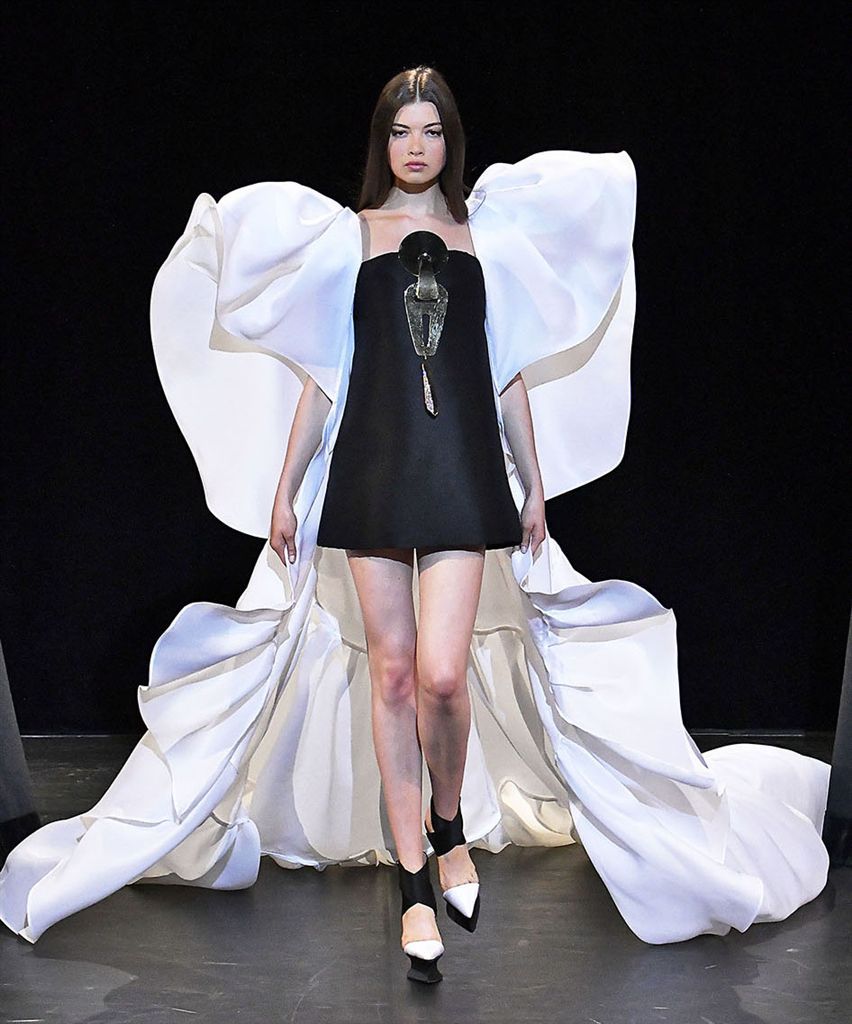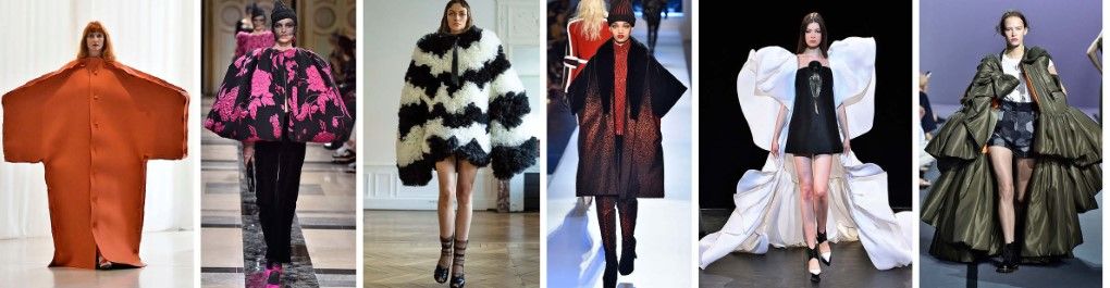 同樣受到2017/18秋冬”瘋狂異想曲”潮流氛圍影響的還有超大的輪廓,將剛才聚焦在肩膀的大裝飾擴及到全身,譬如Adeline Andre透過超大輪廓展現脫去外衣後對比強烈的內層合身優雅洋裝;Giorgio Armani Prive、Hyun Mi Nielsen、與Jean Paul Gaultier則都像拿了放大鏡般,放大外套尺寸並且在袖長或肩膀局部強化戲劇性的比例;Stephane Rolland黑白對比的拖曳裙裝與Viktor&Rolf的舖棉皺褶長版外套,大膽的向左右擴張了原本的人體尺寸比。