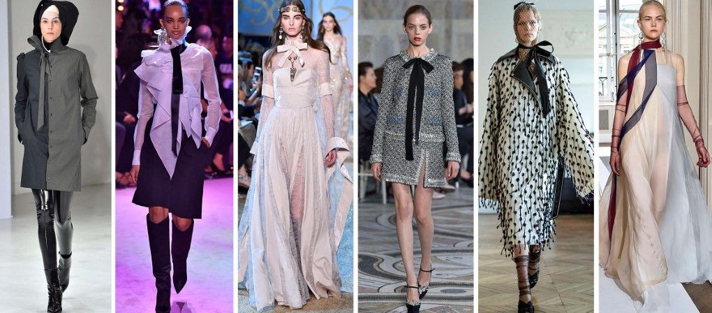 纏綁的細節除了有寬版的表現外,另外有許多集中在領口的細長綁帶設計,譬如Elie Saab與Giambattista都選擇蝴蝶結繫帶的形式,其中Elie Saab的工整簡潔綁法與浪漫的裙型形成對比,Giambattista則以留長的柔軟結飾與嚴謹的套裝款式對比。另外AF Vandevorst、Alexandre Vauthier、與Hyun Mi Nielsen都選用單環節的綁法,隨意的綁繫正適合搭配率性的款式;Schiaparelli則以輕柔飄逸的領巾,讓整體形象彷彿迎風而來的女神。
