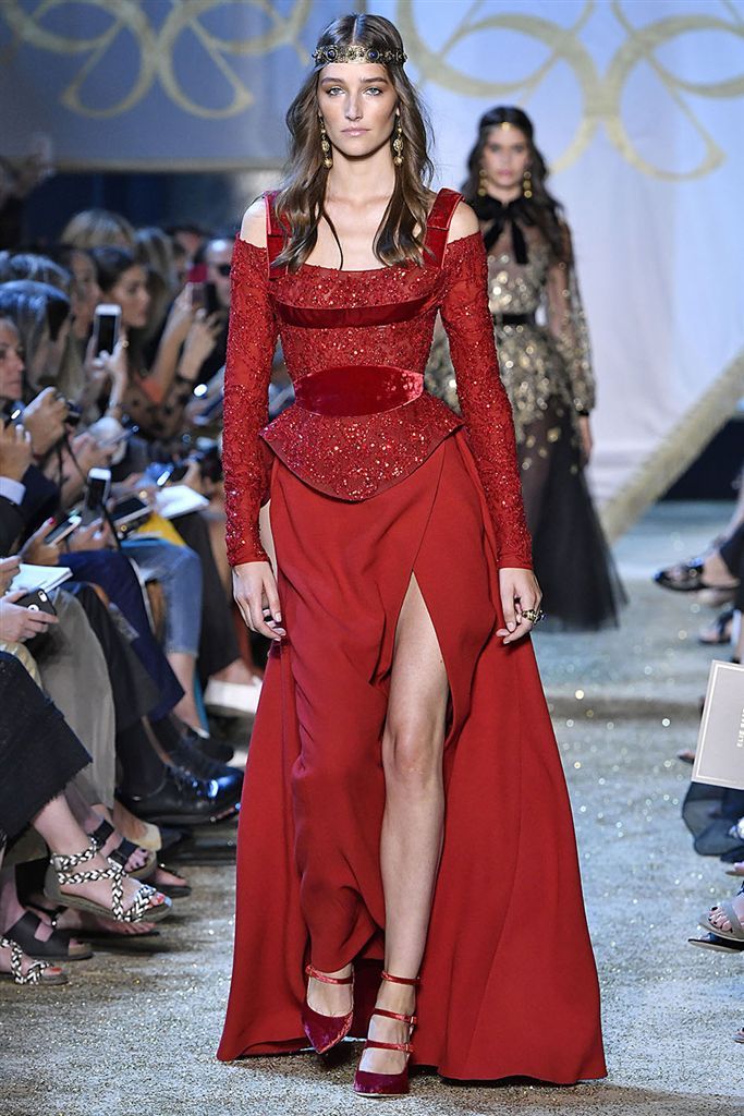 女性的肩頸線條是2017/18秋冬高訂的重點細節,除了有大量的一字型、寬V字型的露肩款式外,出現了許多仍然有肩部或肩帶與袖子結構的局部露肩款式,例如Dundas、Chanel、Giambattista Valli、與Proenza Schouler搭配荷葉與縐褶的短洋裝款式;或是Elie Saab的鮮紅色古典風格禮服,來有Maison Margiela大膽地讓變體的風衣外套款式也展現露肩性感。