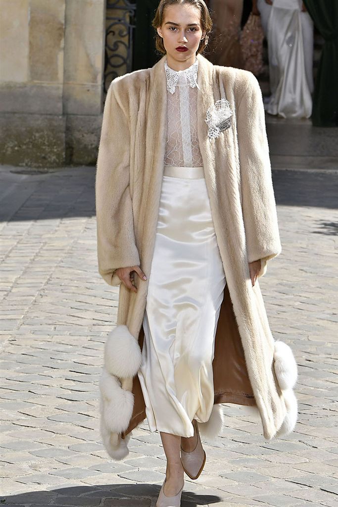 延伸自時裝率性又慵懶的女性風情,也出現在高訂伸展台。譬如偏時裝款的Proenza Schouler以黑白經典配色,搭配前開衩鉛筆裙;另外在高級訂製服的版本,則可見奢華的Ulyana Seergenko長版毛草寬間外套與Azzaro的大皮草領外套,以及走誇張路線的Jean Paul Gaultier與Hyun Mi Nielsen,其中Jean Paul Gaultier以圓潤的肩線搭配毛草領下搭短裙,Hyun Mi Nielsen則是大膽的在胸前開口,搭配上喇叭袖、傘形輪廓的外套與八分喇叭褲,雖然一樣是寬肩款式,卻有非常強烈的現代感。