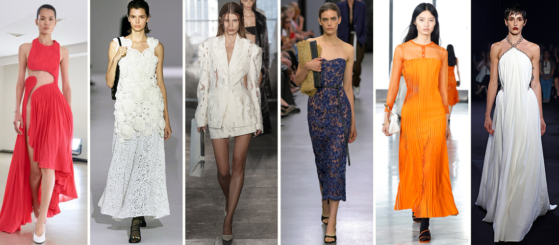 本季趨勢可分為: Khaite和Brandon Maxwell的透膚面料;Proenza Schouler和Ralph Lauren的流蘇細節;Ulla Johnson的粉彩色調;Simkhai和Michael Kors的花卉貼花和3D蕾絲,以及Alaïa和Diotima的鉤針編織和開襟針織。
