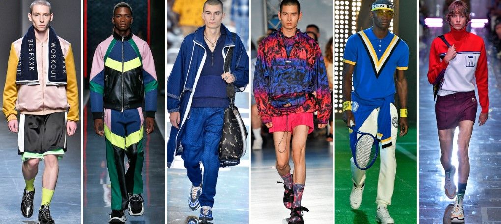 運動風格席捲時尚圈,不論男裝、女裝。2019春夏設計師將活力能量的色彩、俐落的剪接線條及運動類慣用素材…等應用在男裝上,如Besfxxk以飛行外套搭配運動褲,並在球褲上做層次跳色的螢光搭配,使整體更加活潑,打破制式的色彩平衡。Dsquared受到韓國戶外運動品牌的影響,大量使用撞色色塊剪裁拼接,利用色彩的收與放,應用至人體相對位置上,使視覺具有更多層次。