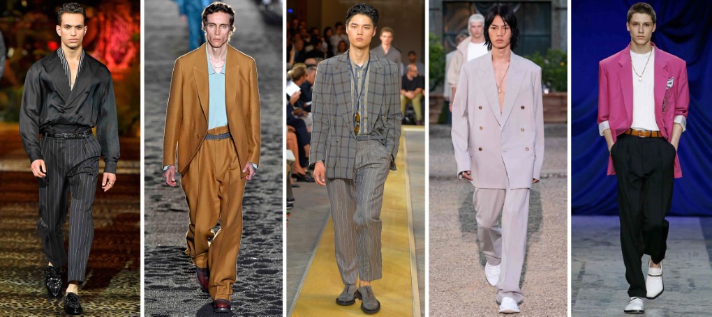 Dolce&Gabbana以柔軟輕飄的材質搭配上復古寬版的西裝版型,將其紮入褲腰內,使大尺寸的西裝有了新穿搭方式。Ermenegildo Zegna運用大墊肩加寬肩膀份量,設計出大尺寸西裝,亦藉由布料的柔軟度,讓身形不會被款式線條框住。Giorgio Armani也是內層置有大墊肩效果,應用褪舊的色彩及復古的格紋,將復古風格表現得十分到位。Givenchy的西裝就像小孩穿大人衣服一樣,超大尺寸、講求份量感而非強調修長身形。Magliano鮮豔色彩的大墊肩西裝外套,搭配休閒感的T恤,如影集中邁阿密的瀟灑形象。