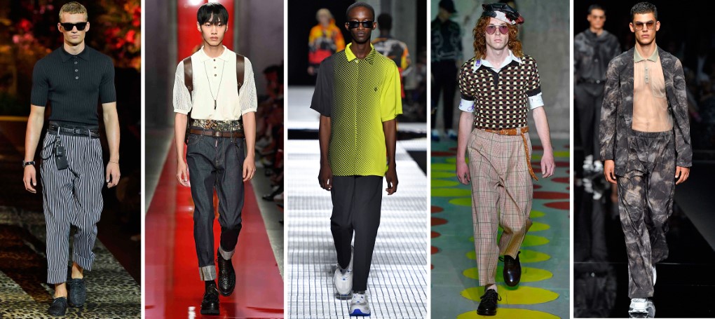 Dolce&Gabbana以假羅紋效果的彈性針織面料作為上衣素材,坑條的直向圖案,讓以往休閒的polo衫多了一分紳士感。Dsquared拼接實與虛的針織布料,並藉由孔洞組織增加透氣度,詮釋polo衫的新表現手法。Emporio Armani的polo衫則以透膚的紗質為主體,搭配羅紋領片、半開襟及胸口口袋,顛覆以往polo衫給人休閒隨性的印象。Marcelo Burlon County of Milan以運動視覺風格為基底,運用不對稱色彩的袖子來延伸線條的方向,利用數位印刷的定位方式,讓成品更具一致性。Marni則以復古的重複幾何搭配淺淡中性色和暖調中間色,內外兩層式的穿搭方式,為復古單品增添時尚趣味。
