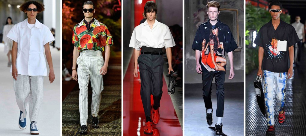 為了展現舒適涼爽的夏日氛圍,設計師紛紛推出洛杉磯形象的夏威夷衫和保齡球衫。Sunnei以素面襯衫為主體,利用腰部抽繩的變化,增加單品的設計感。Dsquared以寬袖規矩的襯衫,與收腳的西褲做出完美比例的搭配。