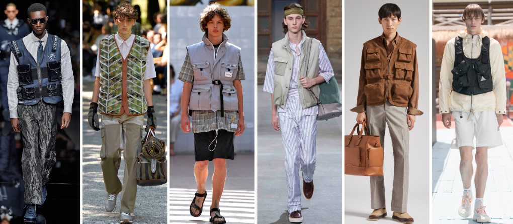 具有立體感的背心出現在夏日,為整體搭配增添了一絲份量感。設計師們紛紛融入戶外及運動機能性元素,包括口袋、繩帶與金屬扣件等。Emporio Armani以防彈背心為發想,加入可調式細節。I Go Out則以釣魚背心為靈感,融入未來機能感,輕薄防水的機能性面料搭配不對稱的立體大口袋,饒富新意。