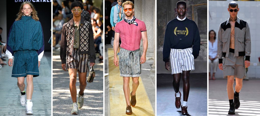 類似拳擊短褲的單品,寬口褲管,腰部可調節鬆緊的抽繩設計,加上以各種圖紋效果,整體造型顯得輕鬆又休閒。David Catalan小方格紋搭配褲腳反折的白色出芽效果,,以拳擊褲為版型基礎延伸加入學院風元素,搭配運動外套搭配,別有一種新感官。Fendi將時尚休閒的直條紋,套入寬口的拳擊短褲版型中,完全打散條紋規矩穩重的觀感,呈現一種新鮮的調性。Giorgio Armani則是將抽繩短褲,用隨興亂捲的手法把褲腳上捲,搭配精緻手染的粉色上衣,展現一種隨性但優雅的情調。M1992的白底直線條短褲,就像男生的平織四角褲一樣,混配學院風運動衫,不尋常的搭配讓人忍不住多看一眼。