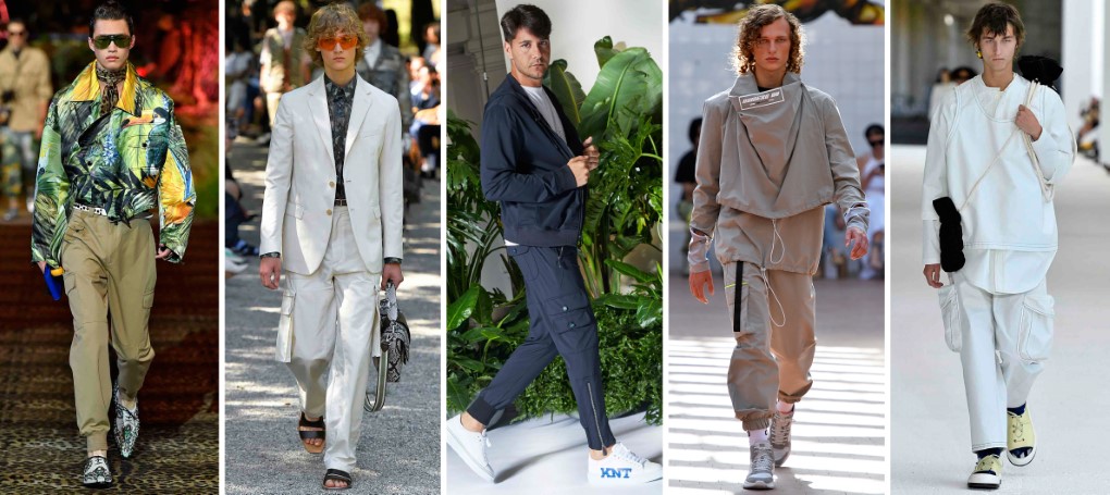 Dolce&Gabbana以戶外登山機能長褲款式為基礎,搭配功能性的貼袋設計及年輕感的束腳設計。Fendi也是以戶外登山長褲為靈感,值得注意的是他的貼口袋是以拉鍊可組裝拆卸的模組設計。Kiton運用羅紋束腳與拉鍊等運動重點打造貼腿大口袋長褲,俐落且具休閒感。Numero 00則採用鬆緊帶褲腳結合卡其休閒長褲的設計,帶出運動魂的時尚單品。Sunnei以加框的誇張立體貼帶為重點設計,結合硬挺布料讓單品的輪廓線條更為豐富。