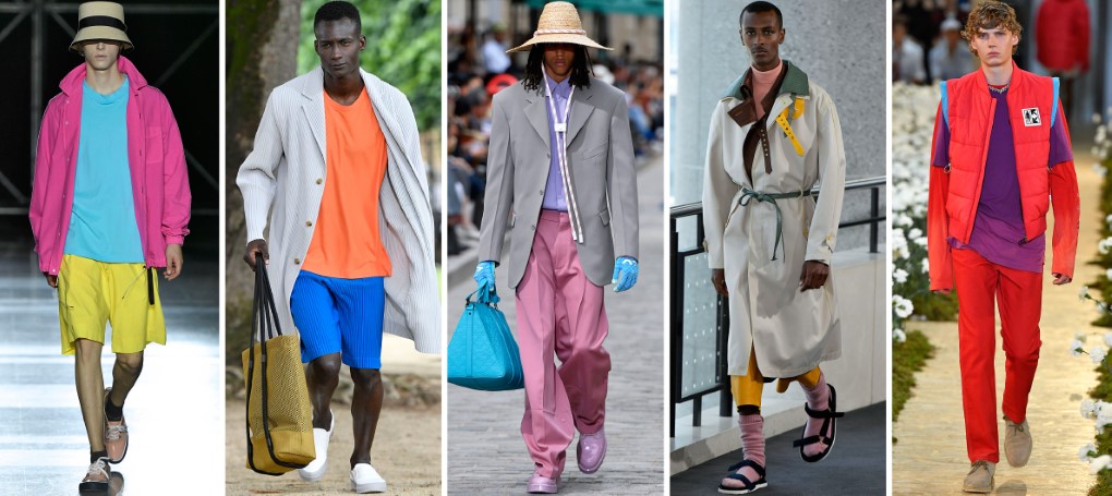 20春夏男裝雖然以淺色為大宗巴黎,但仍保有鮮明對比、饒富趣味的色彩運用,色塊式的搭配組合非常適合創造愉快的視覺效果。Fumito Ganryu運用三原色的亮彩單品,以桃紅、淺藍、亮黃作搭配組合。Homme Plisse Issey Miyake以對比的亮橘、寶藍搭配中性的淺灰,純淨中帶有活力。Louis Vuitton則是選用紫丁香搭配桃紅及中性灰,協調的三色搭配,活潑卻不失莊重。Sies Marjan則是以大面積的中性色調重點搭配粉色上衣及亮黃長褲,為服裝注入活力青春感。Off White以鮮豔的紅色、紫色、水藍色,強烈的色塊搭配,呈現活力個性。
