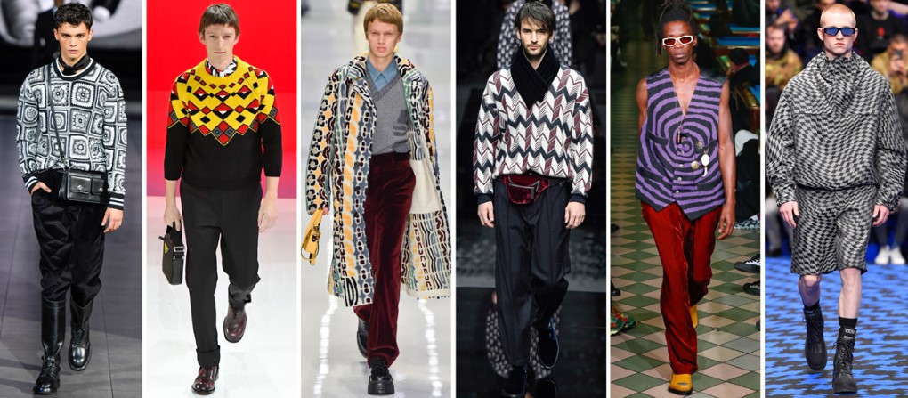 2020/21秋冬米蘭男裝以強烈的色彩對比效果結合大面積的幾何線條,展現吸睛效果。Dolce&Gabbana選用手勾靠枕套的圖樣,將黑白色系的幾何塊狀線條循環排列,拼貼出磁磚效果,同中求異,讓畫面多一點小趣味;Prada以鮮明的色彩加上三角型與四角形的規律鏈狀排列,猶如鑽石項鍊一樣;Fendi以鮮艷明亮的黃色與灰濁的褐色和灰色以幾何形狀相間排列,有一種不羈的民俗風格,搭配規矩的內著,呈現相互對比的層次;Giorgio Armani則是以不間斷的橫向閃電排列,除了線條粗細不同外,也利用色彩對比產生律動效果;Magliano則以渦旋的圓圈線條做大面積的應用,在視覺上有一種要被吸入的感覺;Marcelo Burlon視幻感的菱格紋,以幾何打造迷幻感。