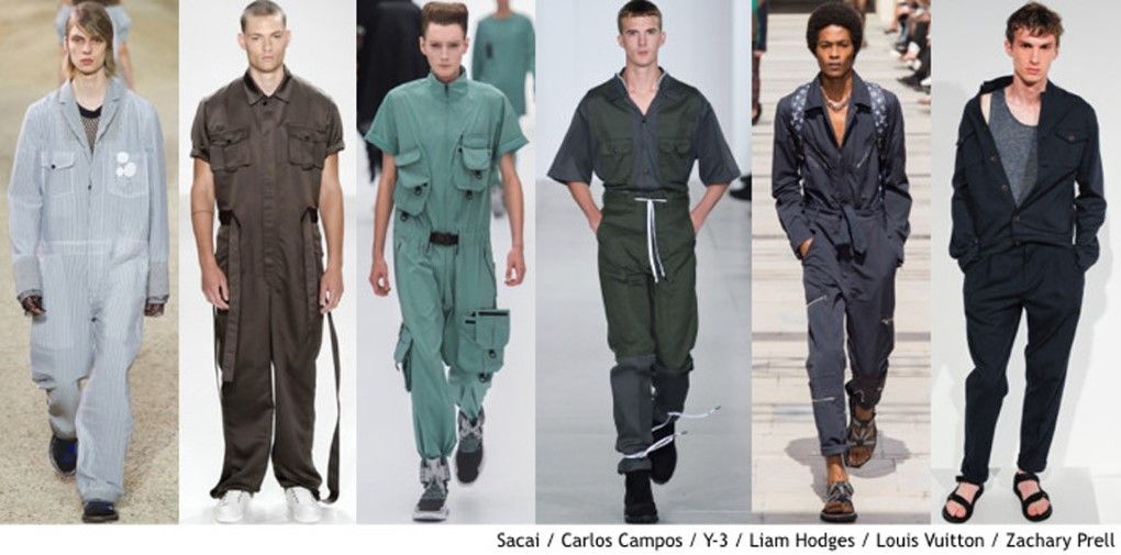 連身工裝預計也將在運動市場中掀起一陣流行。例如Carlos Campos和 Y-3偏重機能導向,有很多的立式口袋與綁繩細節。Sacai 走的是寬鬆輪廓線條,而Liam Hodges 與Louis Vuitton則較為合身,並強調腰部的線條,利用綁帶或是繩索來加強表現。
