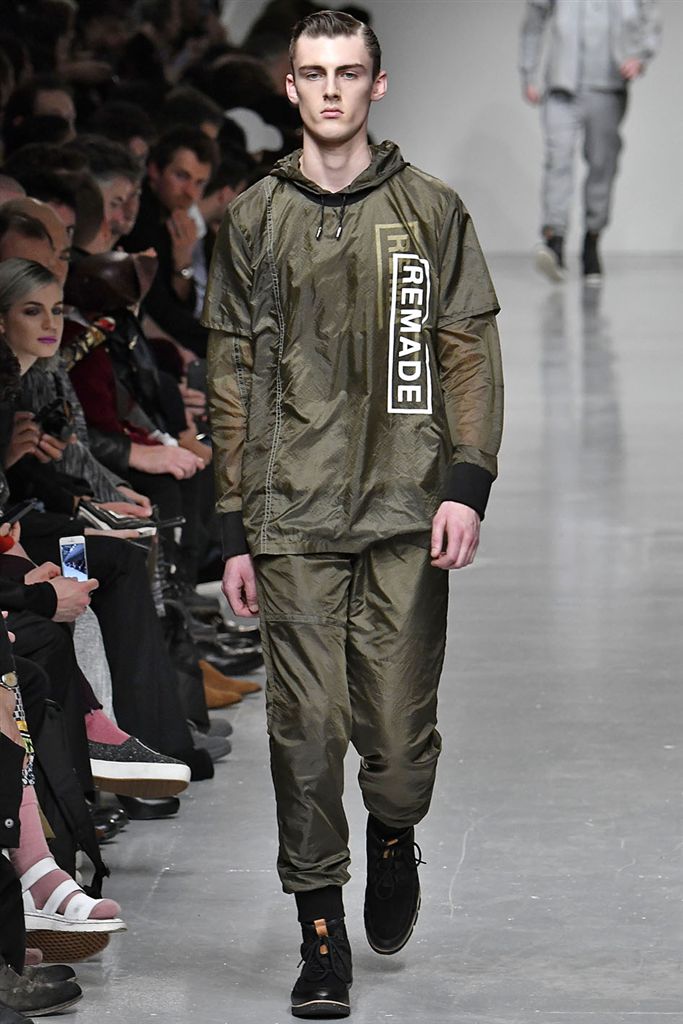 以軍裝回收再製、環保取材聞名的Christopher Raeburn,2017/18秋冬再度以「再造」(Remade)為基調,標榜70%使用有機認證布料,另如透薄上衣和長褲亦是使用回收再生布料製成。街頭與軍旅風,運動風結合工裝元素的黃色警示色塊,綁帶、魔術貼與口袋的加入賦予防風外套和Bomber夾克新的機能感。其他重點還有:迷彩、色塊拼接、對比衣袖、7分~9分的運動風或休閒風長褲。