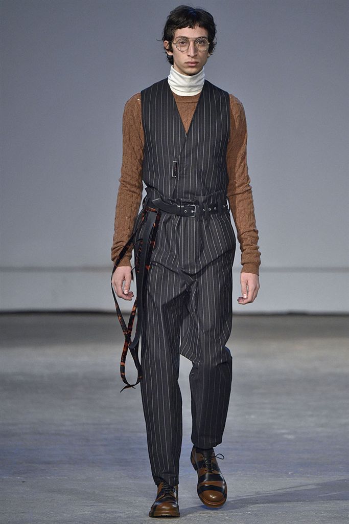 Damir Doma將他著名的部落風和跨文化織紋,與懷舊元素、雕塑輪廓融合在一起。粉筆白條紋與無領西裝、寬鬆量感長褲等單品結合,重塑經典制服。亮橙色日本Noragi和服罩衫以民族風刺繡為設計加分,略微勾破的針織衫爲服裝注入手工感。還有米灰色調超大輪廓層疊綁繫的夾克外套,為跨文化風情注入摩登未來風範。
