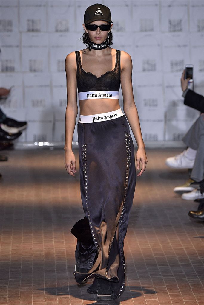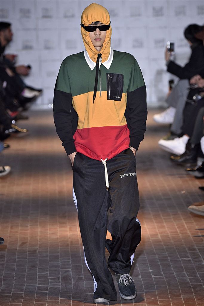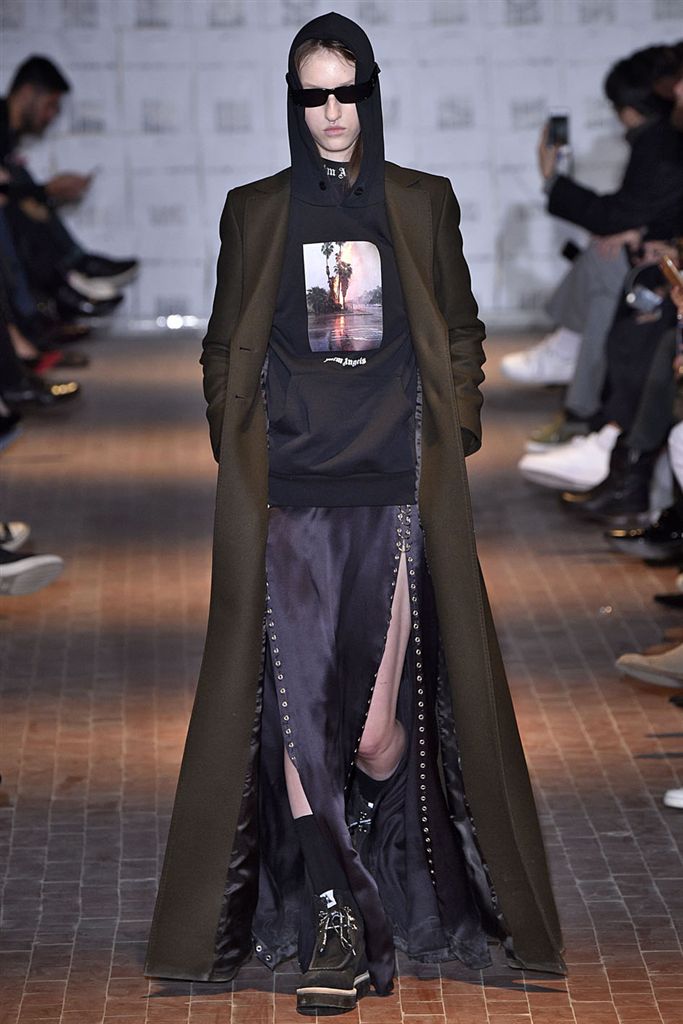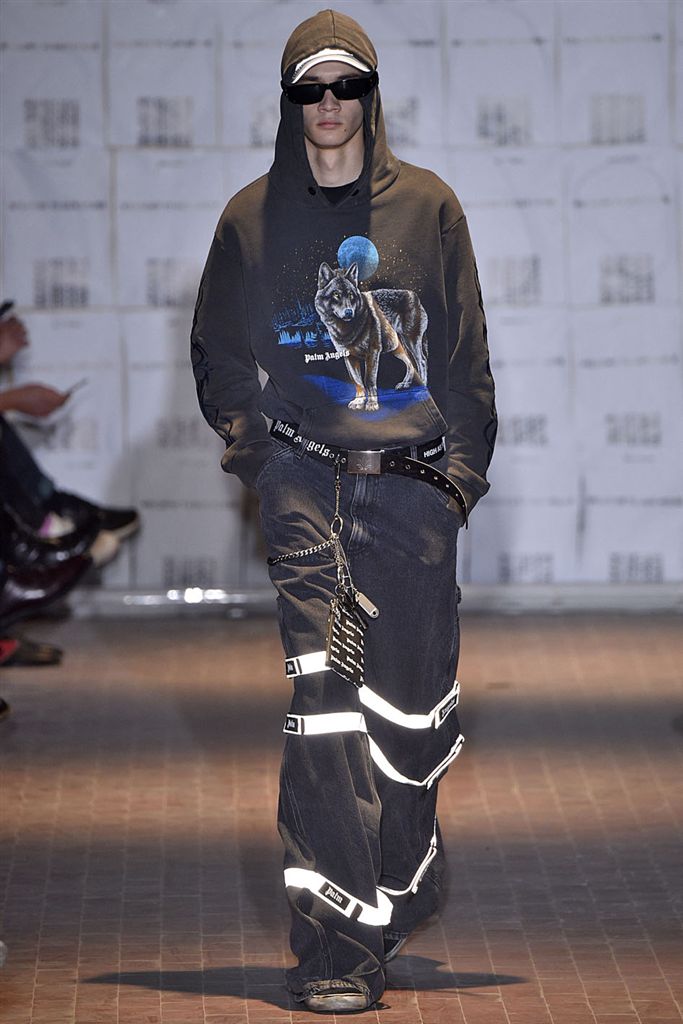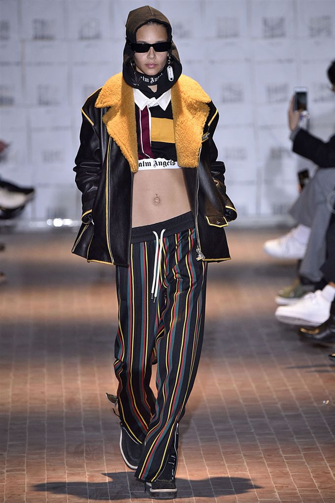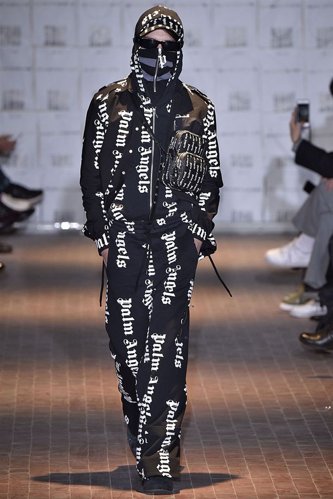 Moncler藝術總監Francesco Ragazzi創立兩年的品牌Palm Angels羽翼初豐。2017/18秋冬Palm Angels以一張洛杉磯滑板好手的相片為靈感。寬鬆的夾克、大衣、輕便西裝、橄欖球衫與運動褲搭配,全件商標運動套裝彰顯了現代街裝的美,還有復古狼圖騰的褪色帽衫。以及工裝元素,例如消防隊員的迷彩夾克以及警示貼條。