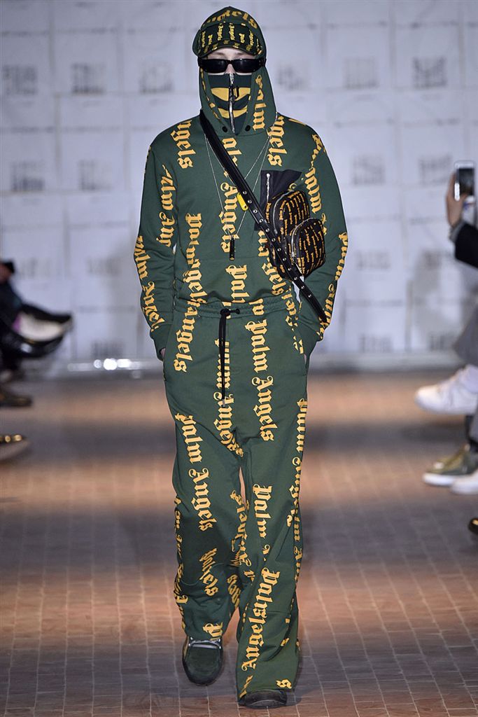 全身式滿版印花在2017/18秋冬佔有重要地位,各種風格主題皆適宜,其中格紋和條紋的戲份尤其重要,例如MSGM將條紋搭配對比白色條紋和單色剪接,增加運動俐落感;Sunnei的橫條休閒套裝帶出現代主義的慵懶個性風格。Palm Angels的標語式印花與對比底色形成令人難以將目光移開的個性造型。Marni維持小清新風格,由小圖案組成的條紋印花更適合大衆市場;Marcelo Burlon County of Milan的抽象暗黑色印花為運動休閒風格帶來新氣象。Moshino的負片寫實花卉印花為軍裝帶來新視覺衝擊;Etro的多色曼陀羅印花搭配柔軟面料觸感帶出奢華家居服風格。