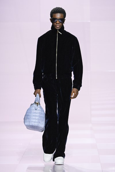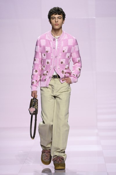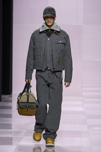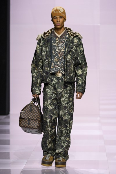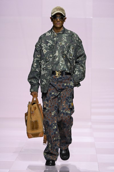 系列探索西裝、工裝與運動裝的跨界組合,像是各種職業裝束以高級布料進行升級,展現街頭與工裝的融合;飛行夾克、羊毛夾克、Louis Vuitton標誌性皮革外套等經典單品透過刺繡、學院風、運動風徽章呈現新意;傳統西裝版型被改良,部分採用短版剪裁,或以皮革與日式工藝元素賦予全新詮釋;搖滾樂、Mod文化等影響貫穿系列,向Pharrell Williams與NIGO的靈感源泉致敬。