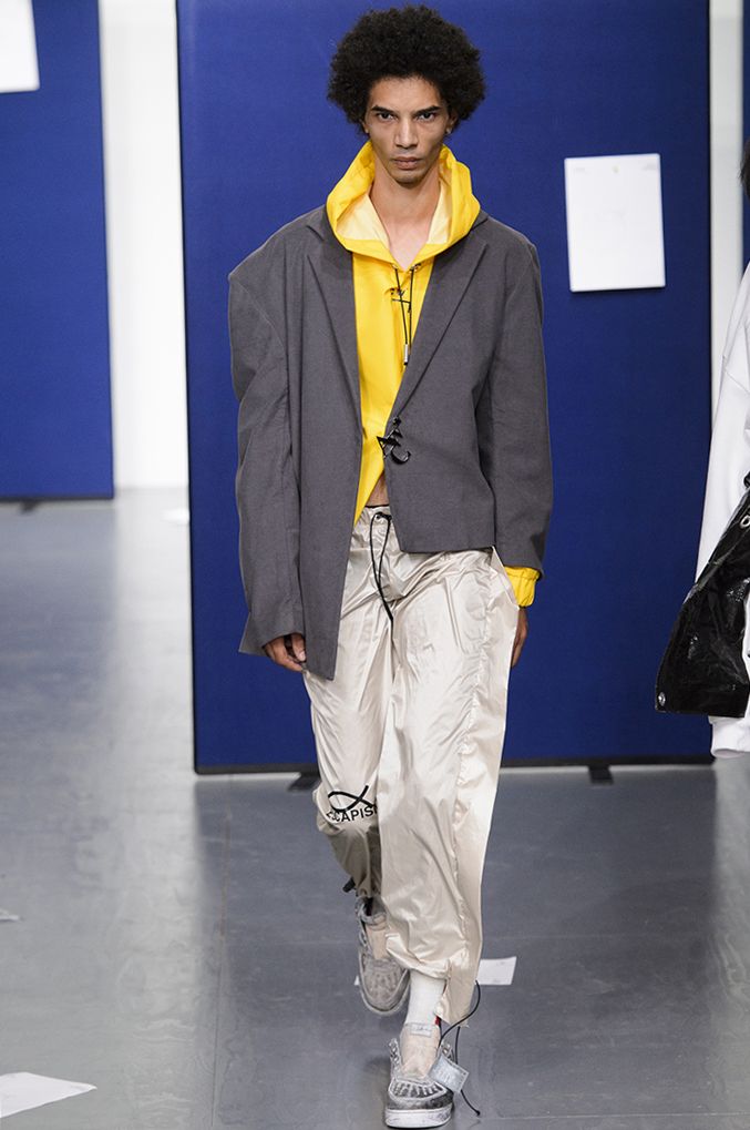 2018春夏A-COLD-WALL靈感來自校園文化與通勤生活,在街頭運動風格與工作服裝之間尋求平衡點。 設計師Samuel Ross運用拼接及挖空設計突顯個性,藉由前衛叛逆的PVC合成亮澤材質,搭配丹寧材質,重新詮釋不對稱連帽衛衣、解構襯衫、適合層搭的高低下擺外套、機能材質長褲…等單品。 此外A-COLD-WALL也將加入「即看即買」的陣容,在秀展之後即於品牌官網販售,預計10-14個工作日消費者就能穿上最新商品。