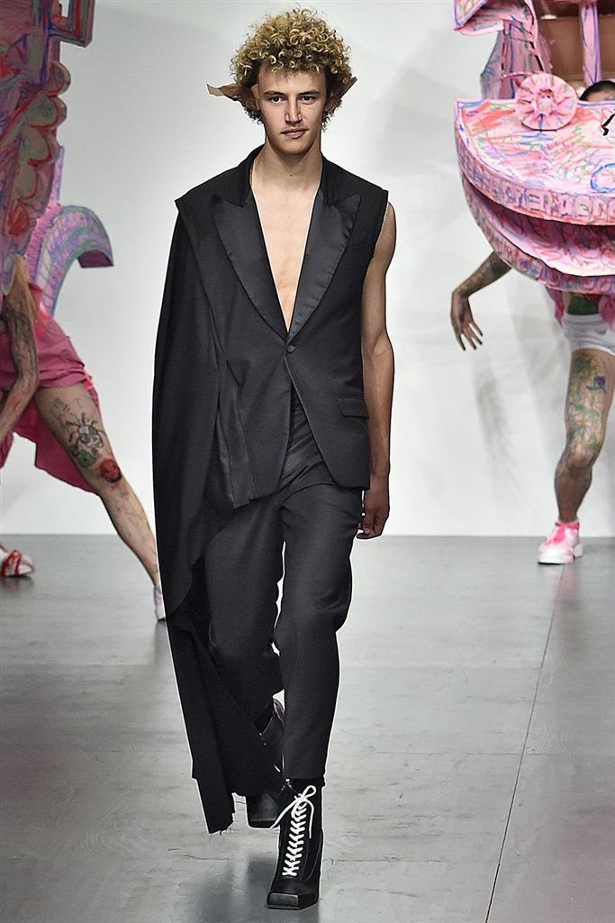2018春夏男裝秀場上,設計師們解構傳統版型,實驗並塑造創新且不對稱的外觀輪廓。Alex Mullins的系列作品中,將半邊版型或花版做變形處理,不張揚、卻具趣味巧思;Charles Jeffrey LOVERBOY以極盡誇張、且看似具破壞性的不對稱作品,表現創意的戲劇效果;KTZ打破結構框架,帶來概念化的剪裁系列。