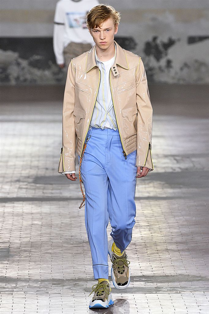 2018春夏米蘭男士們以從所未見的熱情擁抱了運動時尚與街頭潮流的浪潮,復古的全身式運動套裝幾乎成為每位設計師系列中不可或缺的造型,運動風格的長褲、短褲、夾克、運動衫等款型混合了寬大隨性的嘻哈街頭風格輪廓,為秀場帶來一股強大的動態氣場。 除此之外,延伸自冬季的寬鬆輪廓也展開一股80年代的懷舊風情,除了向外擴張肩部線條的power suit概念,還有如同經典影集《邁阿密風雲》(Miami Vice)的場景,男士們以寬肩但又帶有慵懶風情引領出休閒度假、甚至略帶頹廢的隨性舒適風格。 另外吸睛的還有帶甜美夢幻又有趣的中性裝扮,粉嫩、帶灰白的色調搭配隨性組合的圖樣,呈現出渾沌世局中的樂土形象。 其他重要的素材尚包括多元丹寧的面料應用、不同質感的光澤面料、活潑多變的條紋組合等,色彩關鍵則是明亮的極光黃色、巡弋紅、寶藍,搭配上輕甜的微色感中性色,可以想像明年春天的米蘭男裝將在優雅中帶有運動的活力與文青般的詩意。