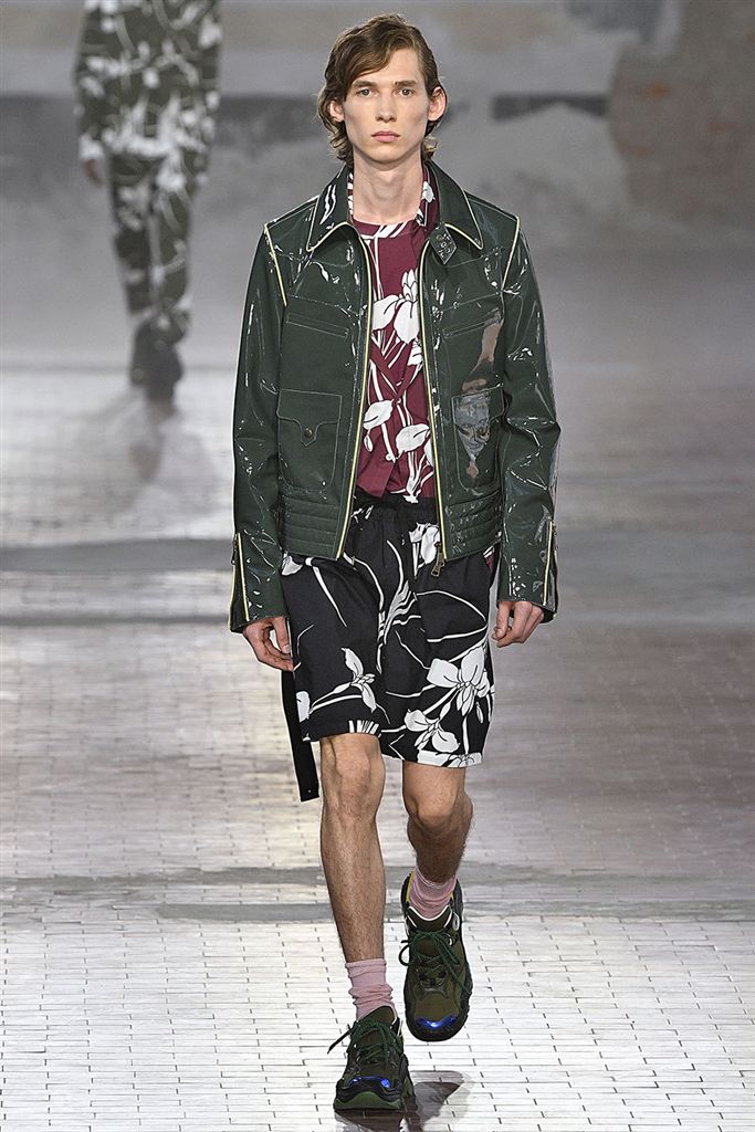 如同果凍凝膠的光澤面料,2018春夏大量的應用在休閒外套款式。譬如Fendi、No21、與Sunnei使用具厚度感的素材製作簡約的短外套款式,其中Fendi配搭局部的皮革、運動感羅紋,使得整體款式性格與質感層次豐富;Frankie Morello與MSGM選用的是較為輕薄半透的膠感素材,搭配運動感的輔料與款型表現,呈現出一種帶有未來感的運動風格;Poan有趣的選用了琥珀色澤的硬挺素材,服裝猶如以獸角製成的盔甲。