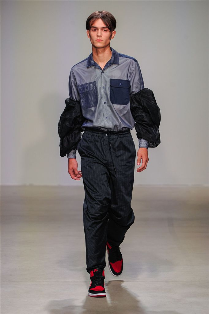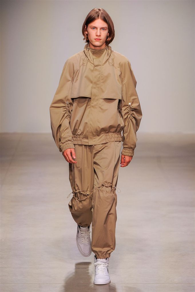 從開場大紅色再到過渡棕、海軍藍與粉紅,王逢陳帶給運動服飾一種新的轉變,為運動棉褲、慢跑服裝、工作服等增加豐富更多細節變化,包括設計師經常愛用的大口袋、3D字體和縫製細節,大量網眼材質與抽繩細節的運用也賦予服裝大膽的結構。幾條圍裙及誇張的手套,更有將工藝帶進日常家居的暗喻。