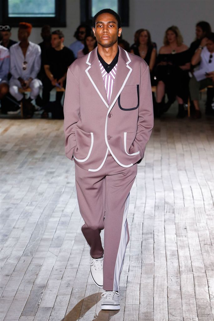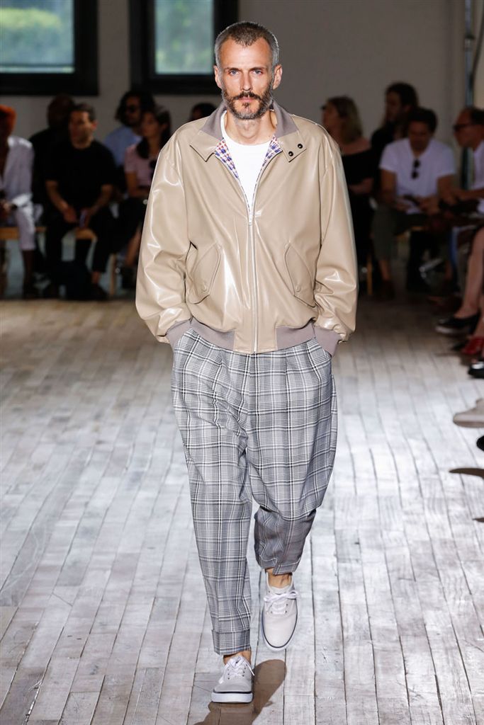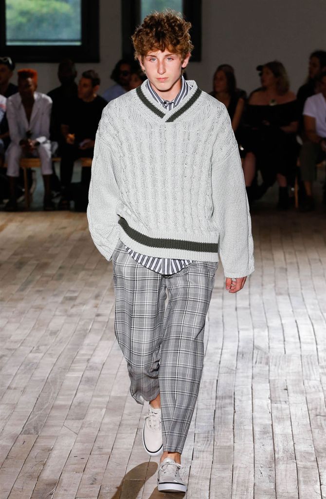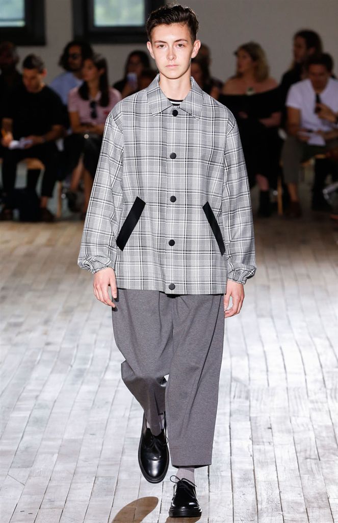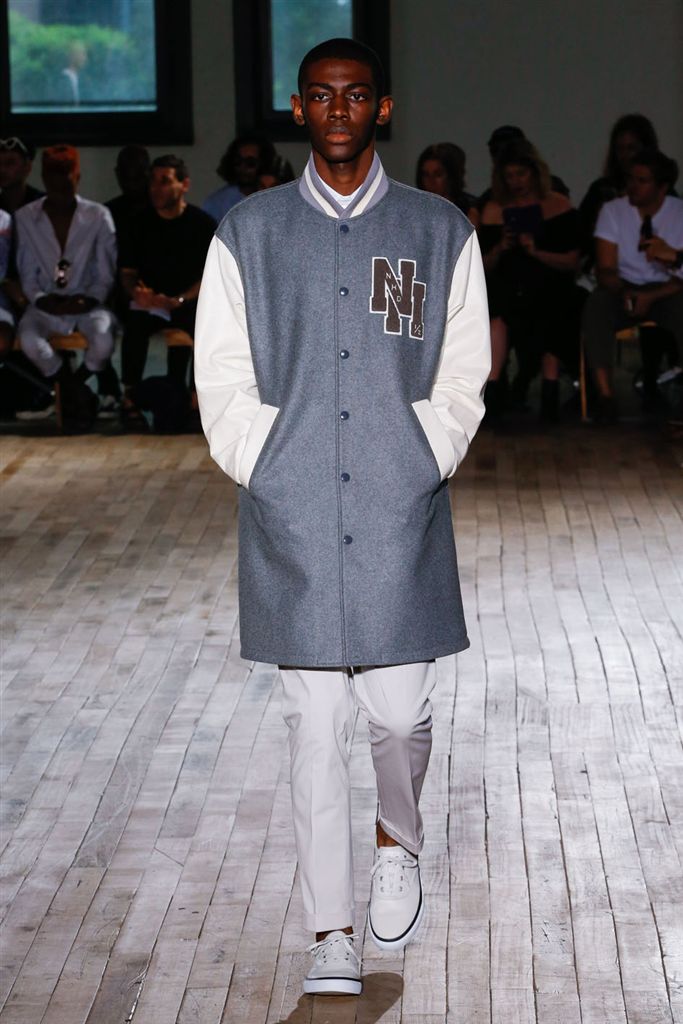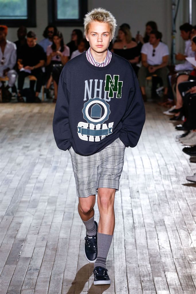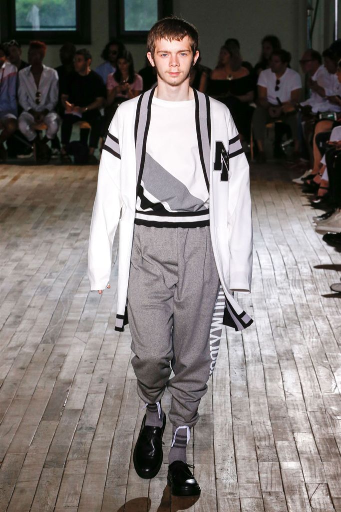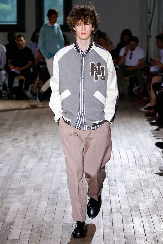 N. Hoolywood在2018春夏走冷靜沉穩的美式經典風格,相較於上季more-is-more繁複的流浪漢主題,有著180度的大轉變。 日本設計師尾花大輔去年在美國正好歷經總統大選,也因此為他開啟了美國歷史之旅,本季以彬彬有禮、清爽而自信的美國前總統約翰‧甘迺迪為範本,象徵更快樂、簡單的美國。 參考50年代帶點運動的常春藤學院風,從短版的休閒西裝到帶有文字貼布的棒球外套、寬鬆的絞花毛衣,配上加長露出一截的襯衫,設計師以柔軟的剪裁輪廓、更分層潛能,跨季穿衣的概念,展現傳統風格的現代詮釋。