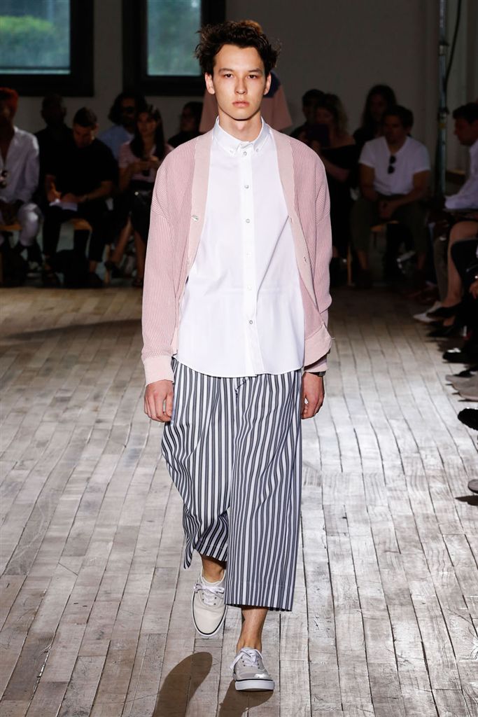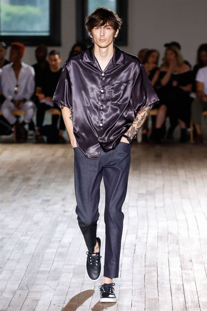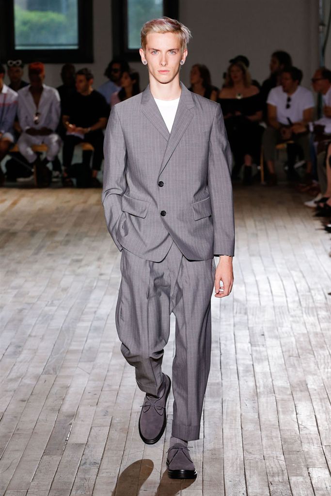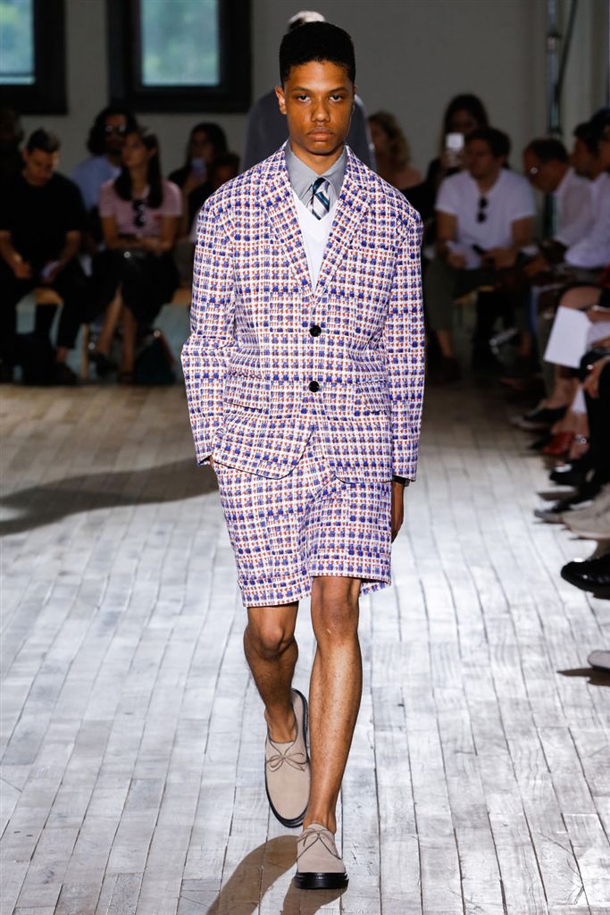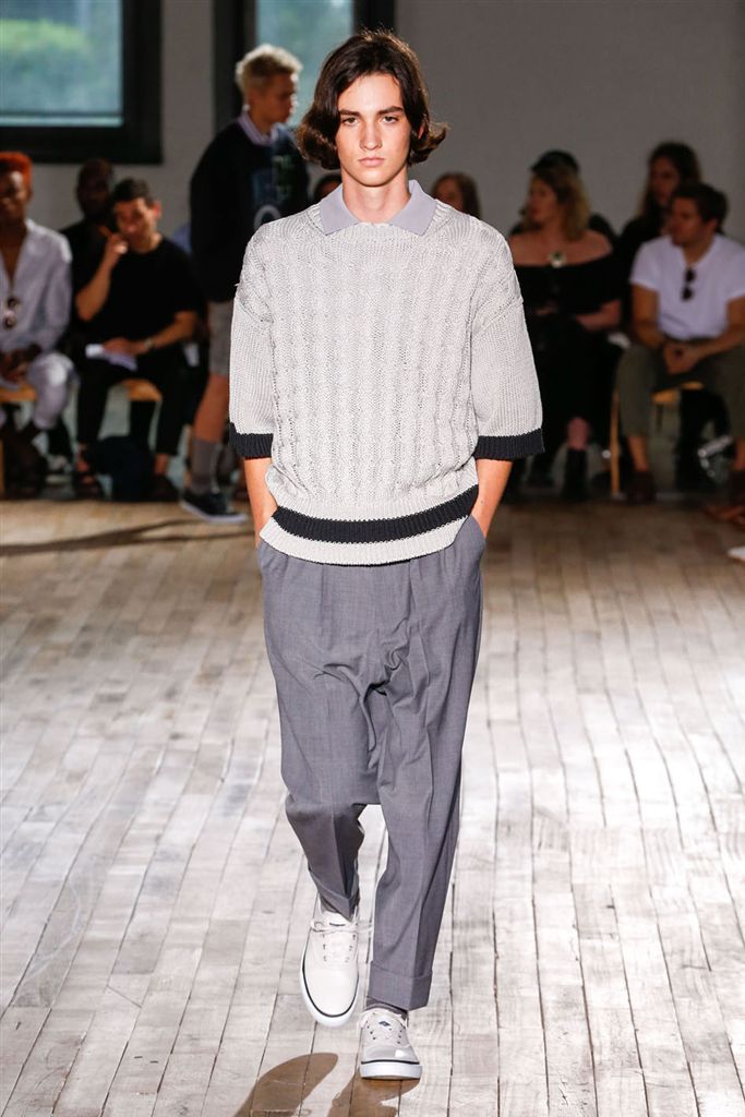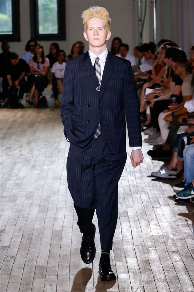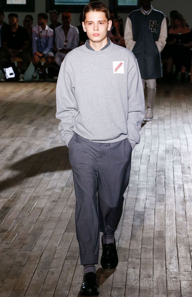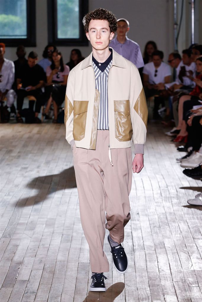 N. Hoolywood在2018春夏走冷靜沉穩的美式經典風格,相較於上季more-is-more繁複的流浪漢主題,有著180度的大轉變。 日本設計師尾花大輔去年在美國正好歷經總統大選,也因此為他開啟了美國歷史之旅,本季以彬彬有禮、清爽而自信的美國前總統約翰‧甘迺迪為範本,象徵更快樂、簡單的美國。 參考50年代帶點運動的常春藤學院風,從短版的休閒西裝到帶有文字貼布的棒球外套、寬鬆的絞花毛衣,配上加長露出一截的襯衫,設計師以柔軟的剪裁輪廓、更分層潛能,跨季穿衣的概念,展現傳統風格的現代詮釋。