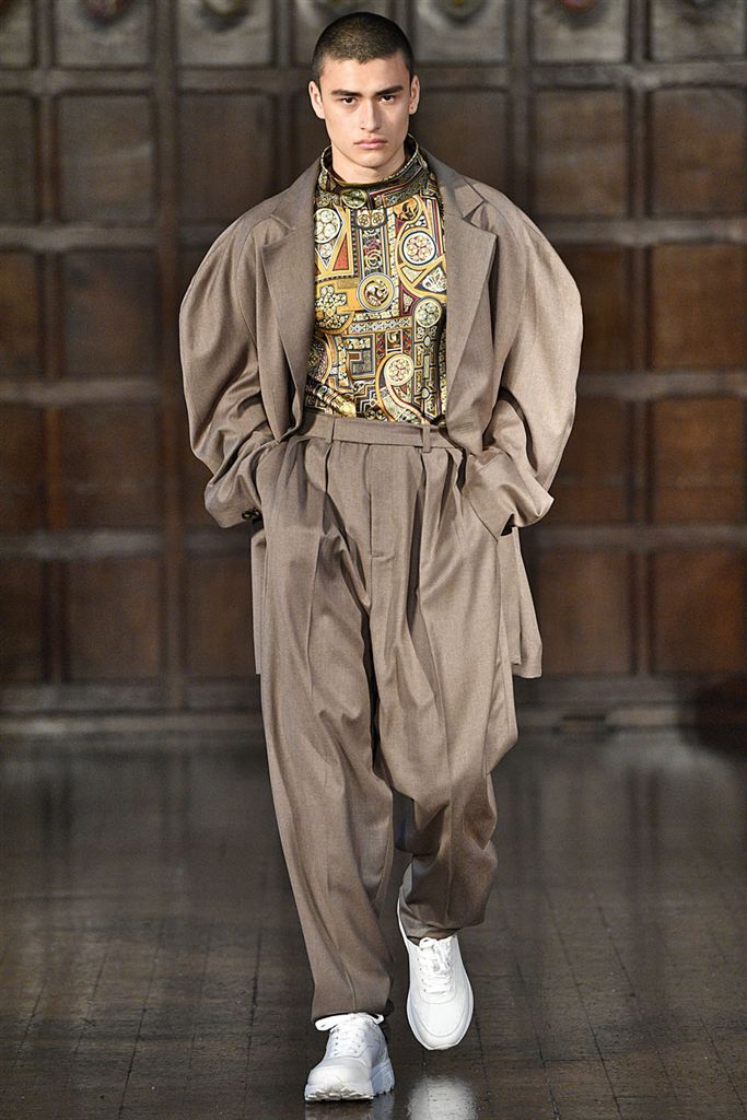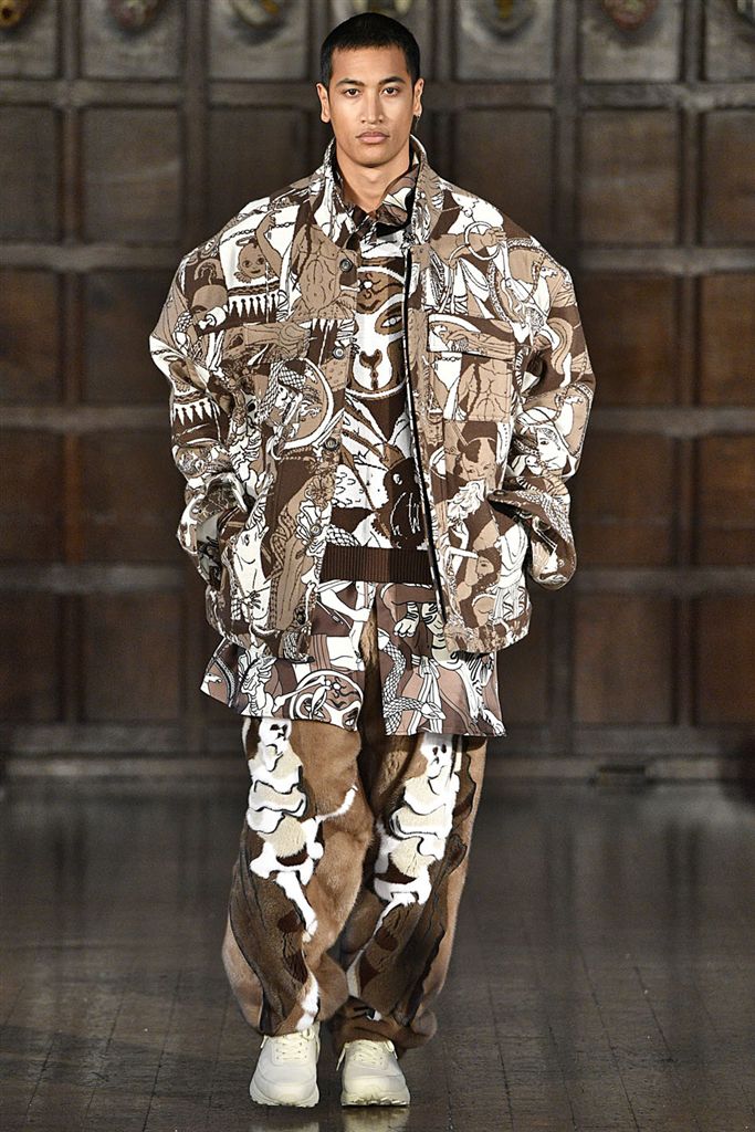 設計師引用“繪文字”的概念,將人物與動物化為抽象印花,表現於各種不同的織物媒材,搭配誇大的oversize輪廓(尤其強調肩袖的線條)與棕色調的色板,展現出一種融貫東西的奢華民族街頭格調。